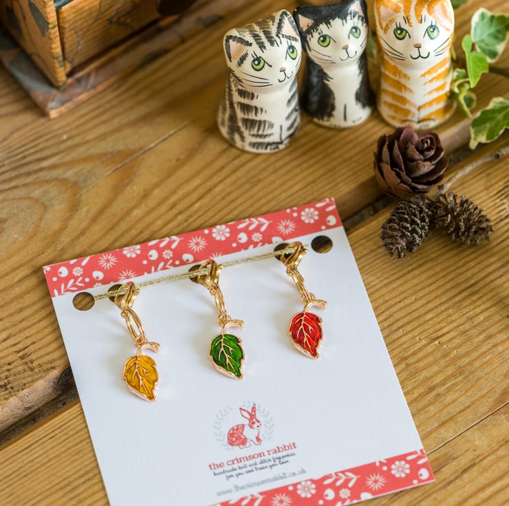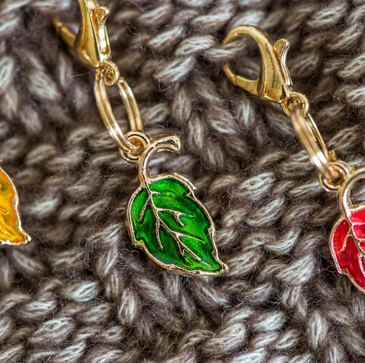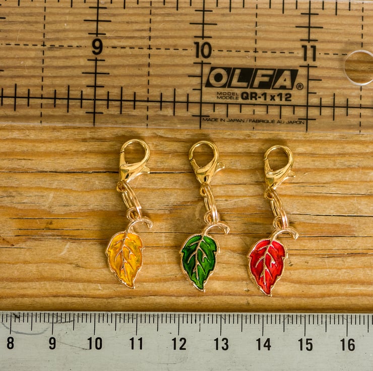 The charms themselves are 20mm by 10mm and are lightweight, despite being made of metal. They come in the set of 3 different colourways that you see here and each one will have a split ring and a lobster clasp attached so that you can use them as stitch markers or progress keepers. One thing I've found since I started collecting stitch markers is that I like to be able to use them as both things and that I sometimes want to slip them onto larger needles, so I've used a slightly larger than usual split ring that you can slip onto a needle as large as 6mm easily. Because it's a split ring, you can easily remove the lobster clasp and put it back on whenever you like, if you like. The lobster clasp easily slips onto a 4mm needle too - I think of it as Transformers for knitting!