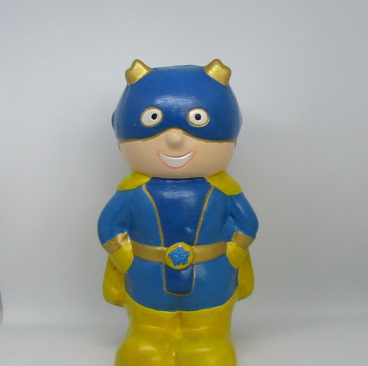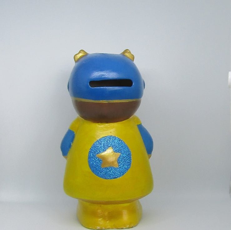 This Super Boy inspired money box is a great way to inspire any young saver. Hand painted in Yellow and Blue the figure stands at 5.5 inches / 14cm high. Coin slot at the back of the head can take all coins. Plastic stopper underneath.