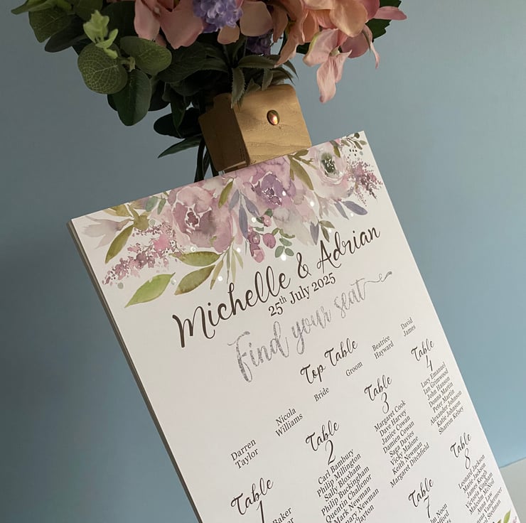 Personalised WEDDING table seating plan A3, A2 and A1 size, Mauve colour, dusty purple flowers, leaves, greenery, foliage, rustic wedding theme design.