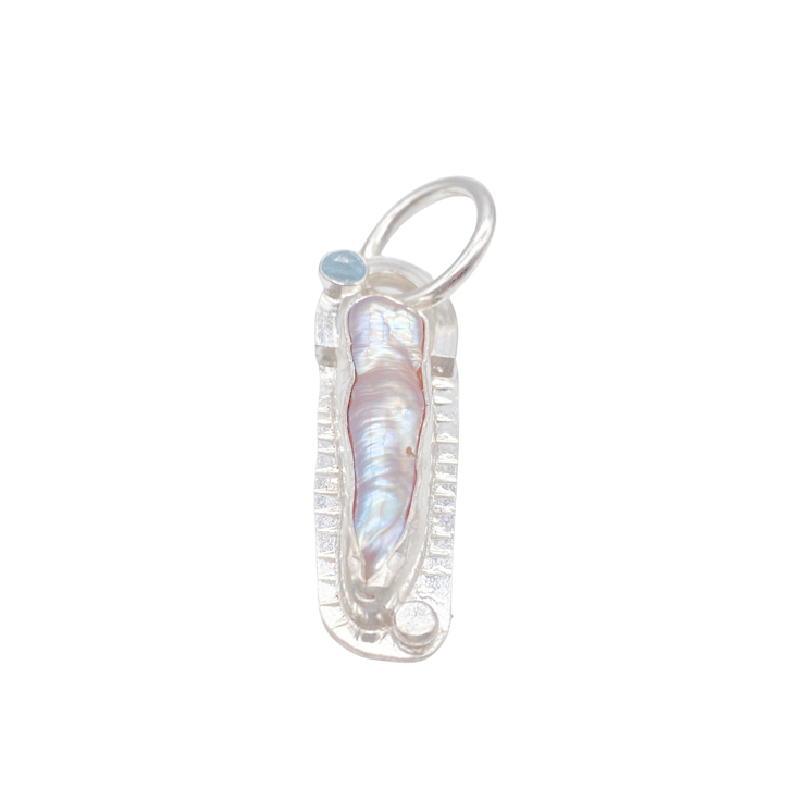 Keshi pearl in a beautiful shade of lilac, put together with a pretty sky blue topaz that’s been rose cut. Wrapped in sterling silver. A unique one of a kind design made in my home studio in the UK.