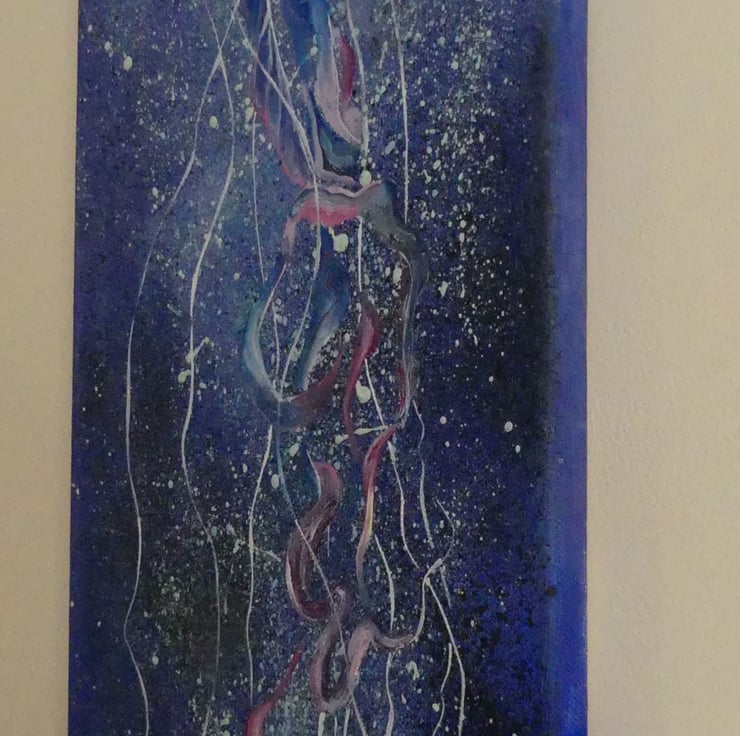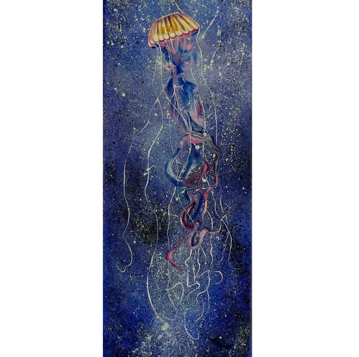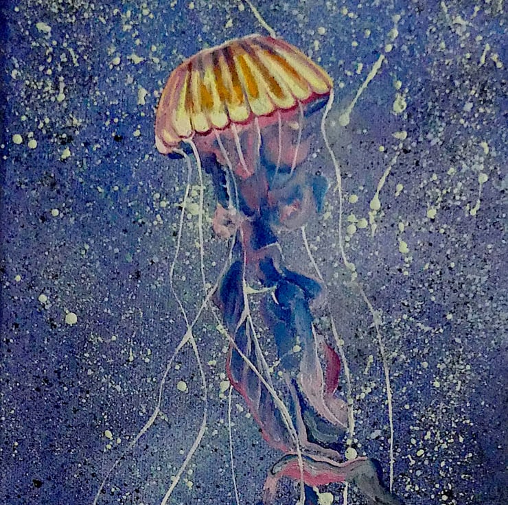 This purple-striped jellyfish is caught in a stream of bubbles and light. I enjoyed playing with colours and flowing forms in this light-hearted vertical oil painting.