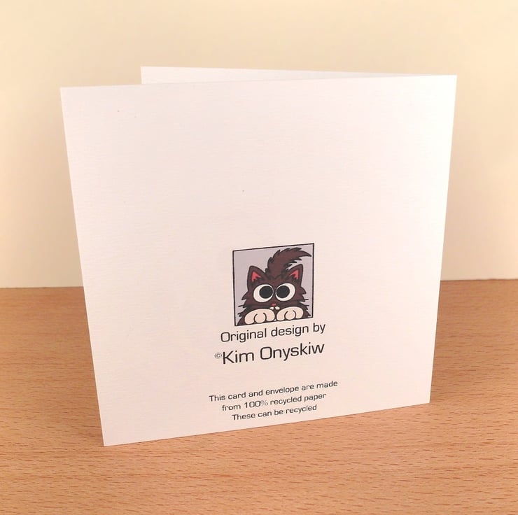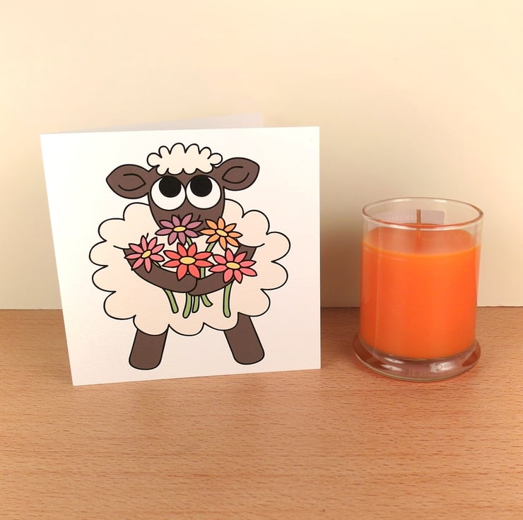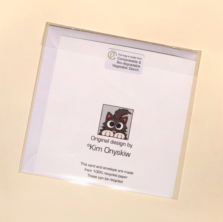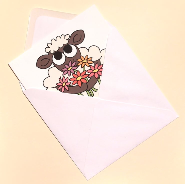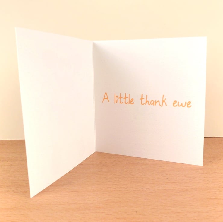 The cartoon sheep design by Kim Onyskiw is printed on a 14cm (5.5") square white card with a 270gsm weight, and comes with a white envelope. Both the card and envelope are 100% recycled. The thank you card will be packaged in a bio-degradable and compostable vegetable starch bag to keep it protected in the post.