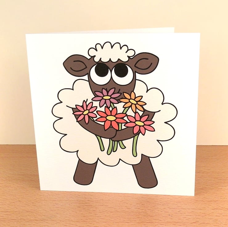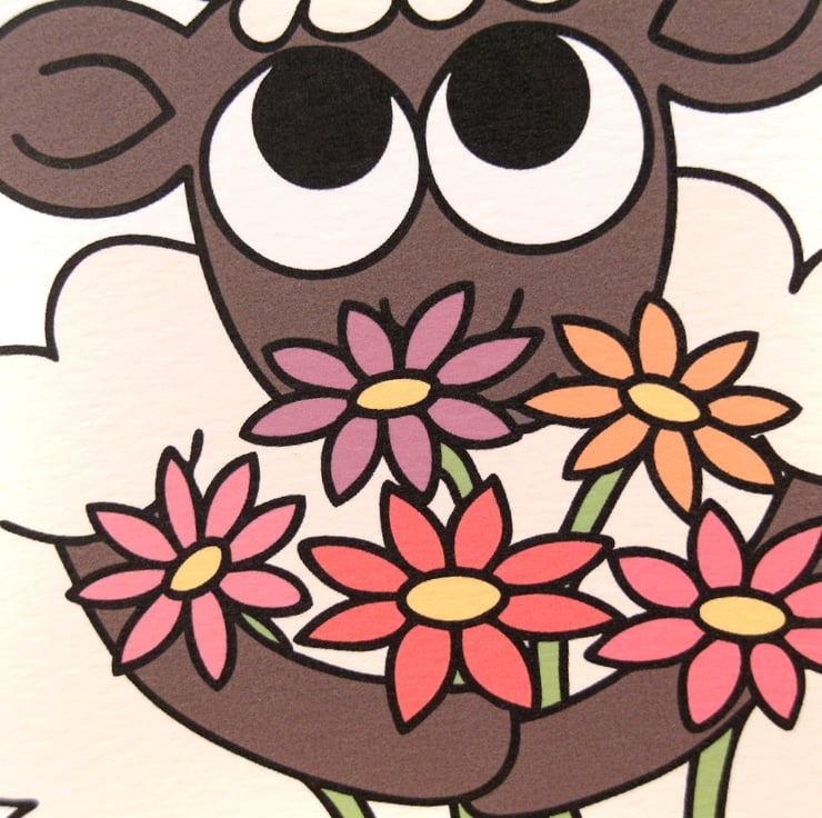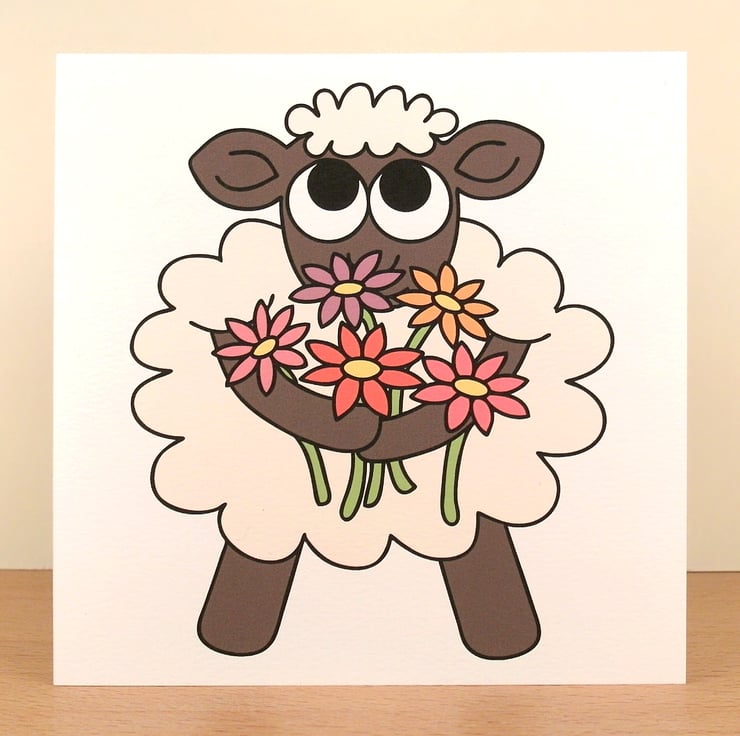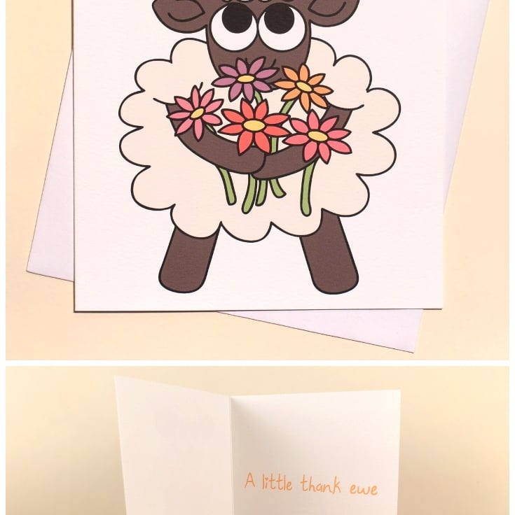 This thank you card features a cute sheep stood on two legs, looking up with big eyes as it holds a collection of colourful flowers it has gathered as a gift. Inside the card is the message "a little thank ewe".