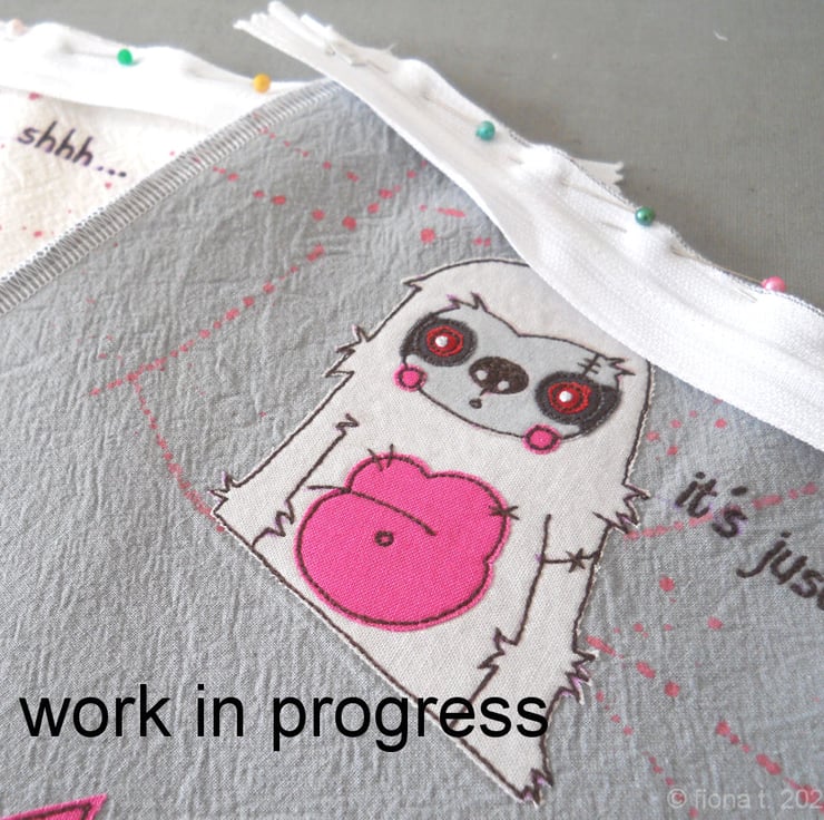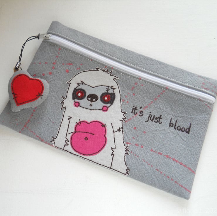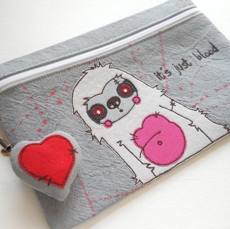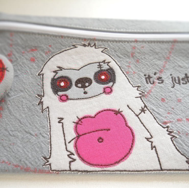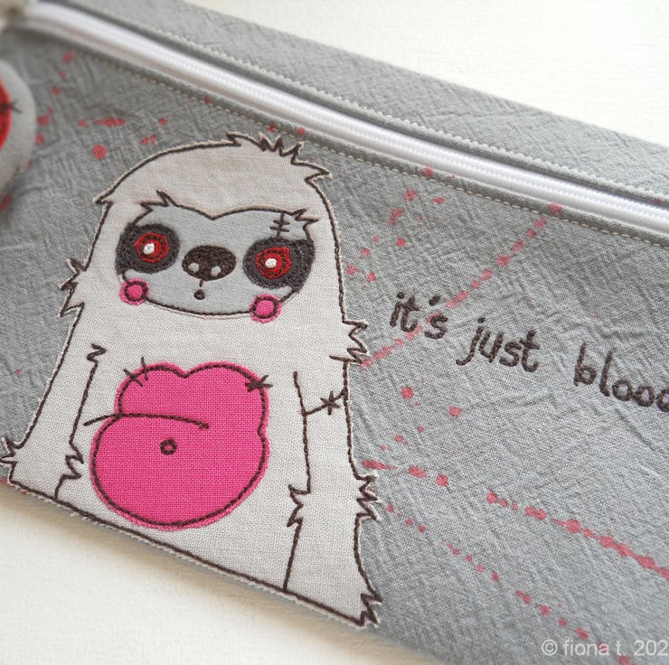 applique & freehand embroidered medium zip case or pouch – zombie sloth.