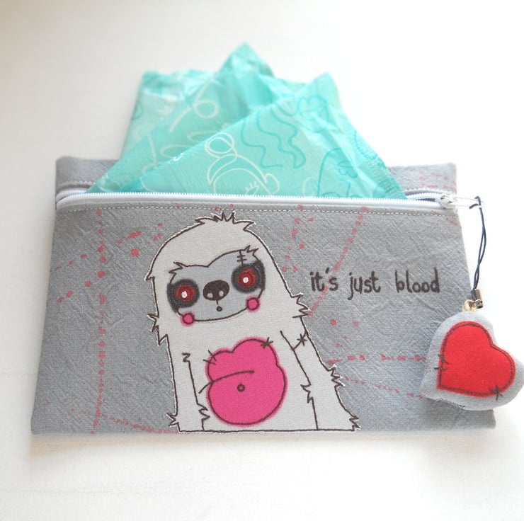 “it’s just blood” a discreet case for stashing lady products, this zip case measures approximately 19cm wide x 12cm (7.5” x 5”)