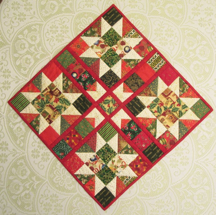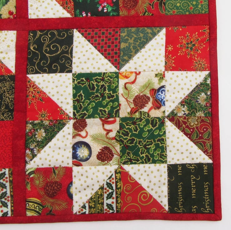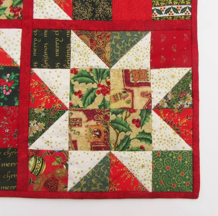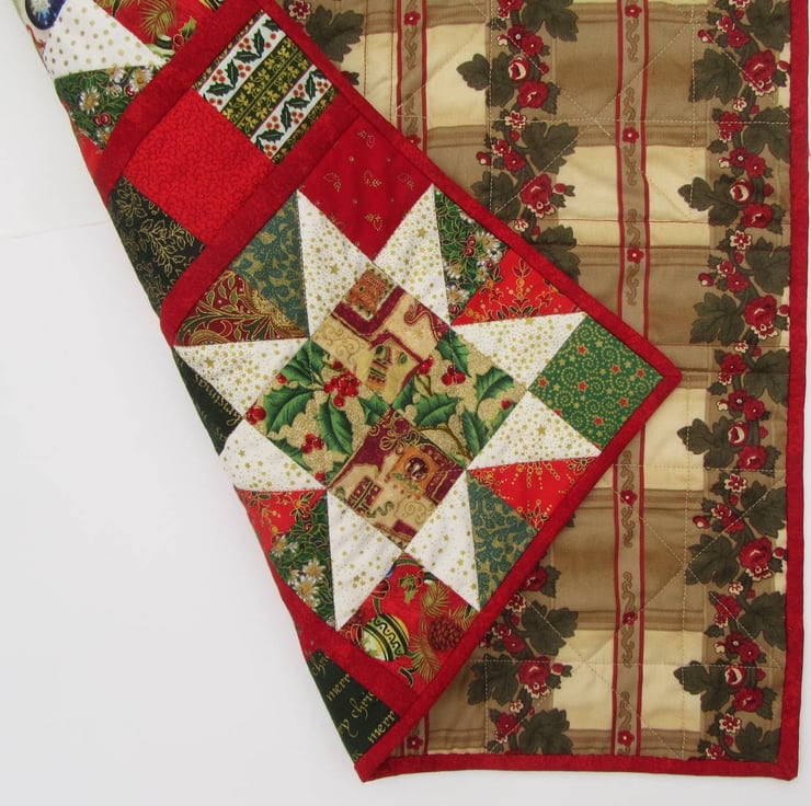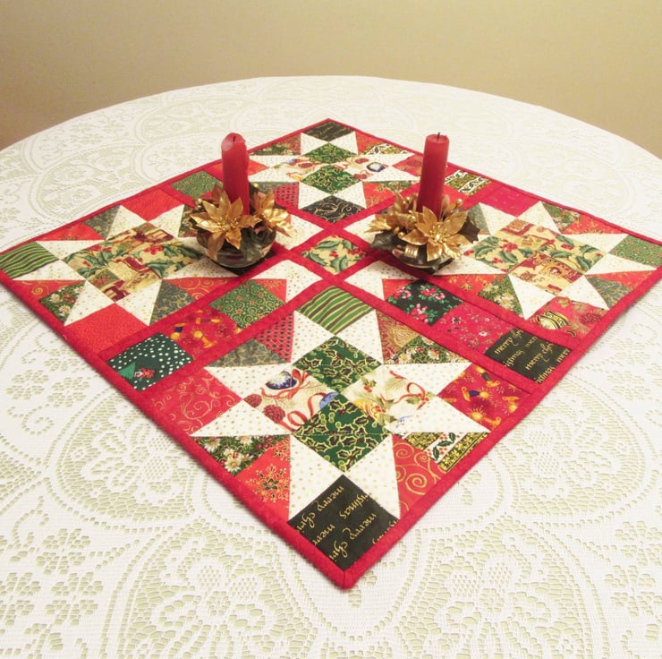 A festive patchwork quilted table topper in traditional colours of red, green, white and gold featuring bright patchwork stars.
