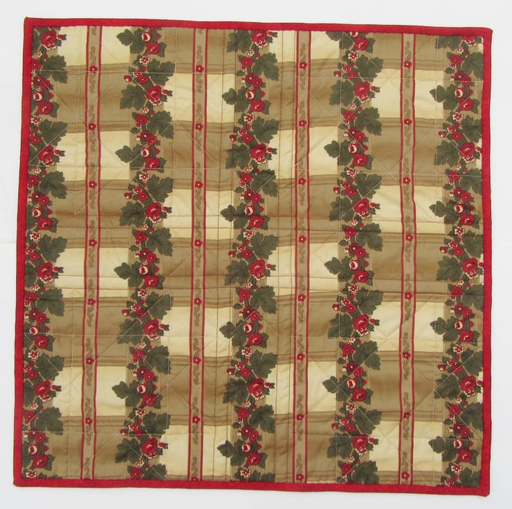Made from 100% cotton fabrics with a middle layer of quilter's wadding. I've quilted around the star shapes to give the topper extra texture and interest. The rich red binding fabric has been stitched in place by hand to make an extra-neat finish.
