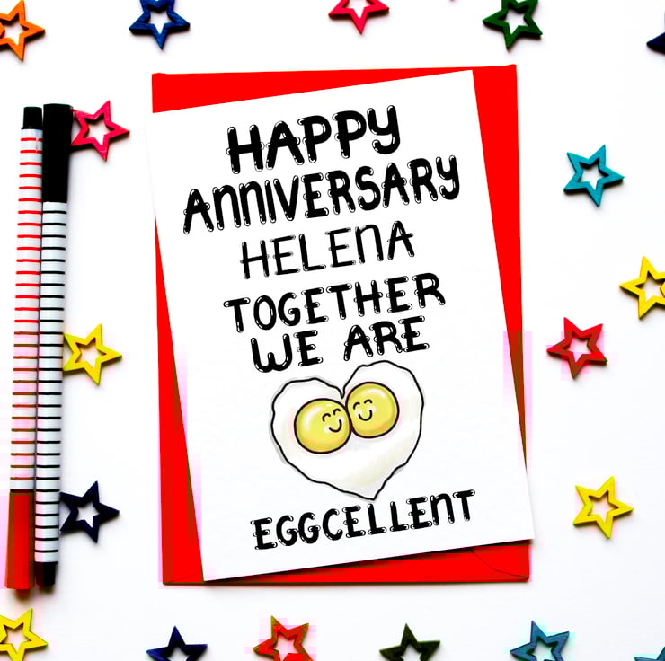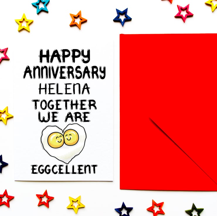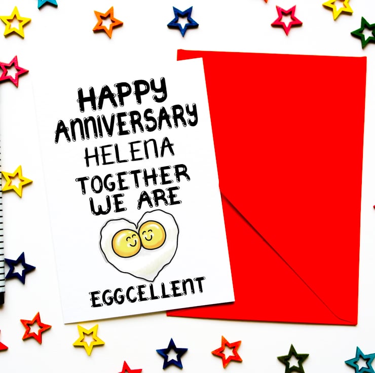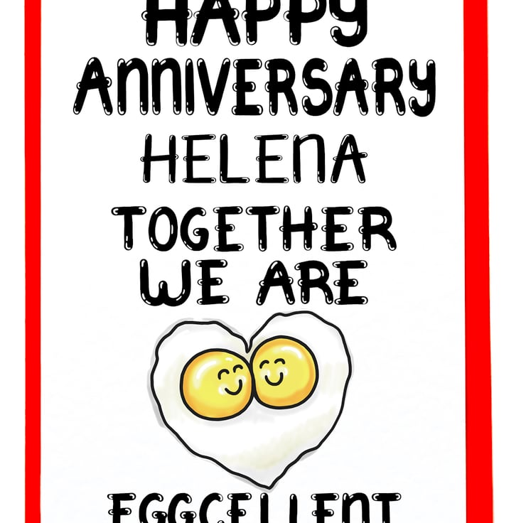 Greeting on front: HAPPY ANNIVERSARY (NAME) TOGETHER WE ARE EGGCELLENT