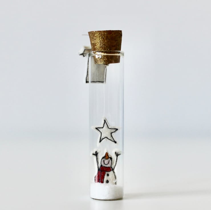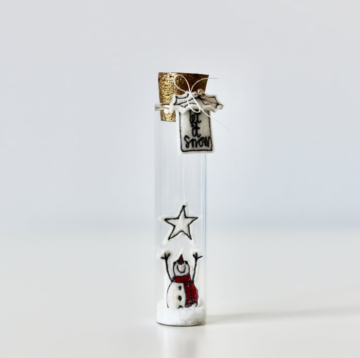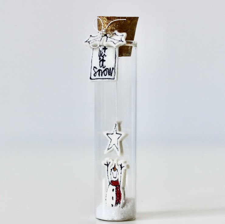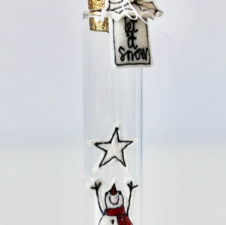 'Let it Snow' is created using 100% cream wool felt and free hand machine embroidery. There is a sewn label attached to the neck of the glass bottle, saying 'let it snow' with holly and three silver metallic glass beads and a gold hand painted cork.