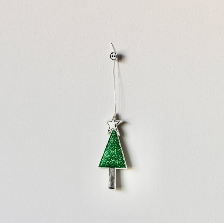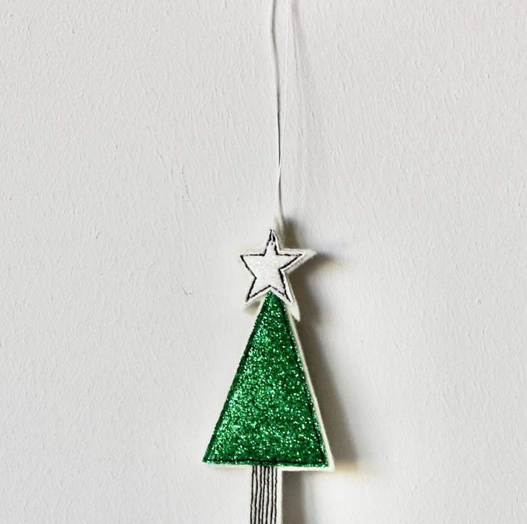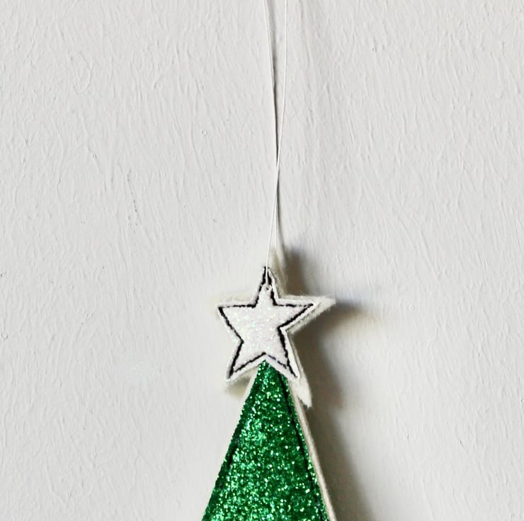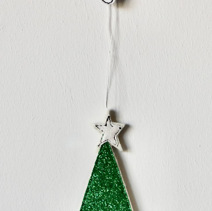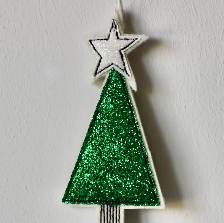 A delightful hanging decoration which is created using 100% wool felt, glitter cloth, free hand machine embroidery and cut out by hand, using a very sharp pair of scissors.