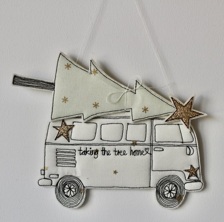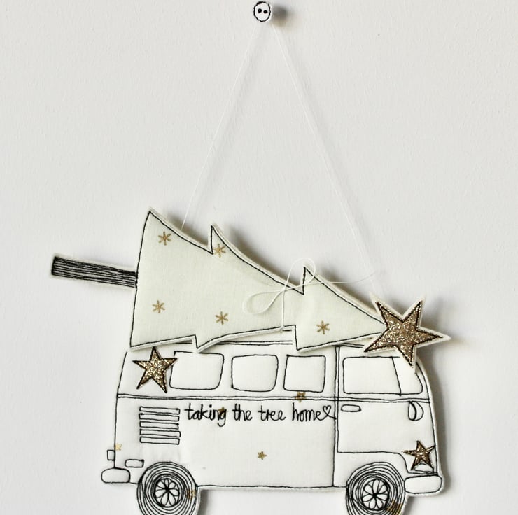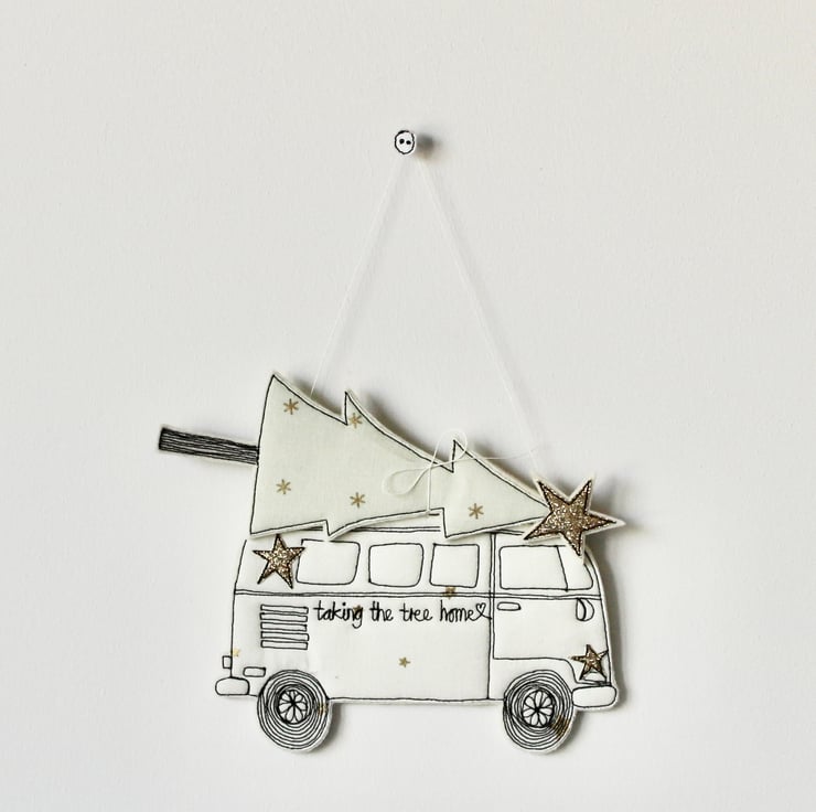Taking the tree home is created using 100% cream wool felt, printed cotton cloth, glitter fabric, freehand machine embroidery and cut out by hand using very sharp scissors.