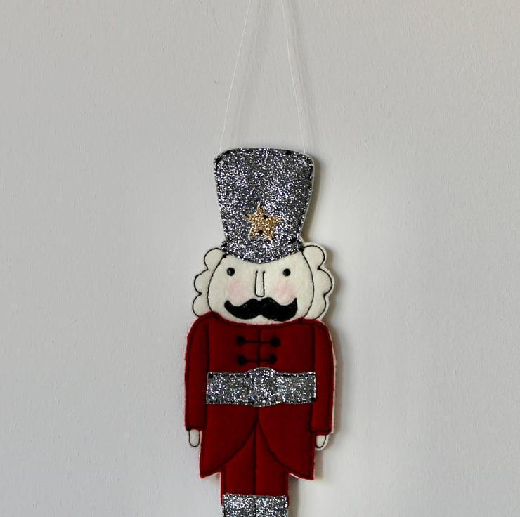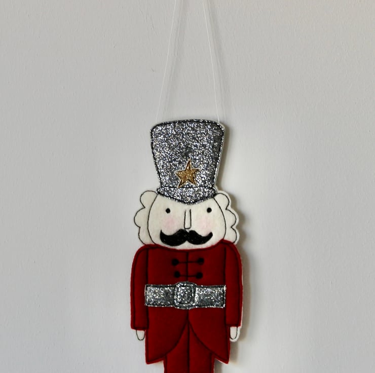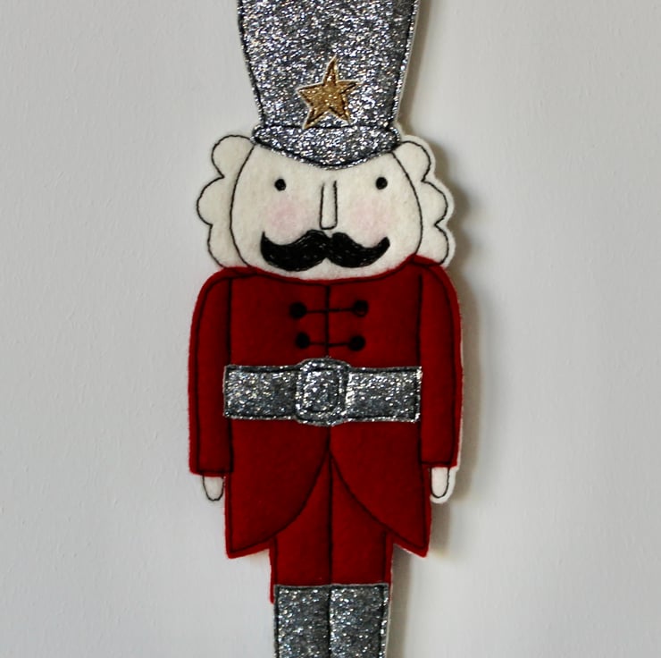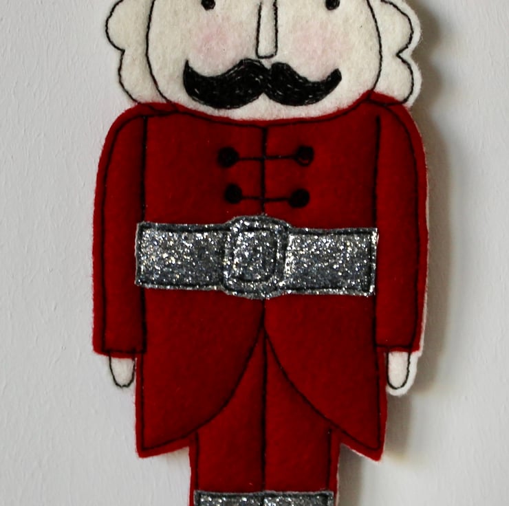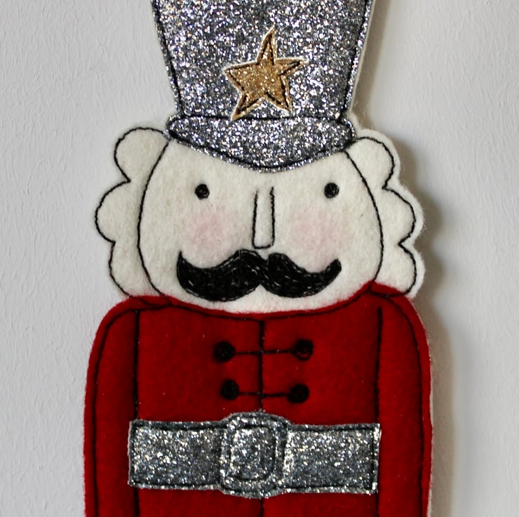 Nutcracker is created using 100% wool cream felt, glitter cloth, linen thread and free hand machine embroidery.