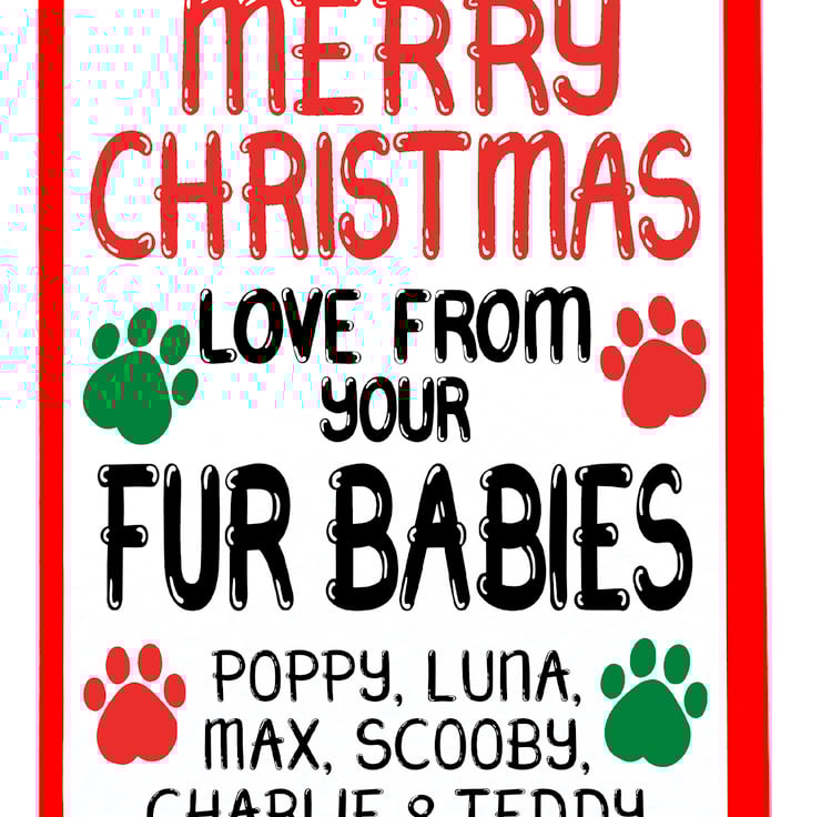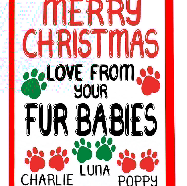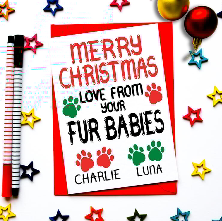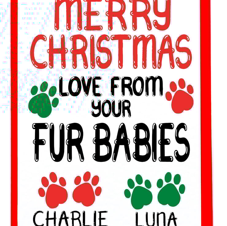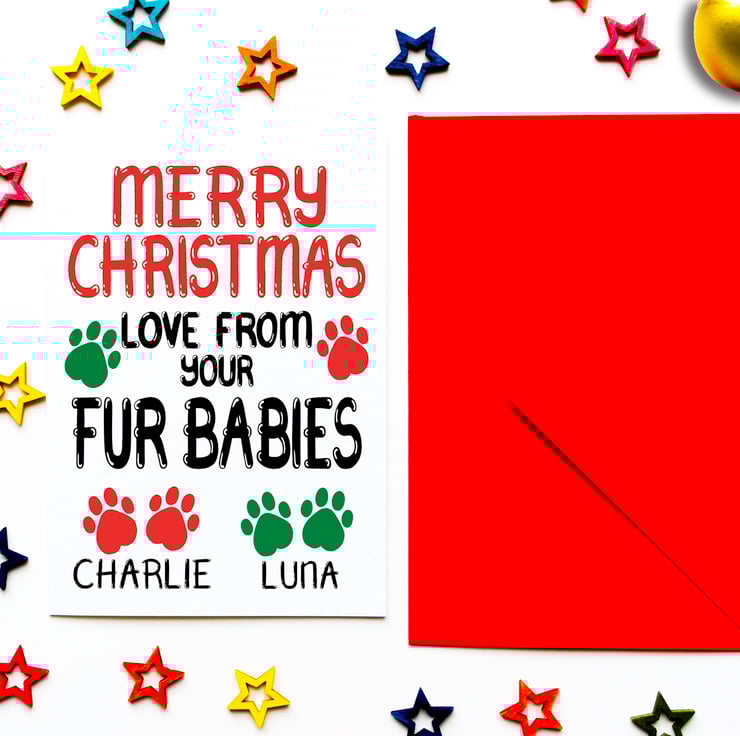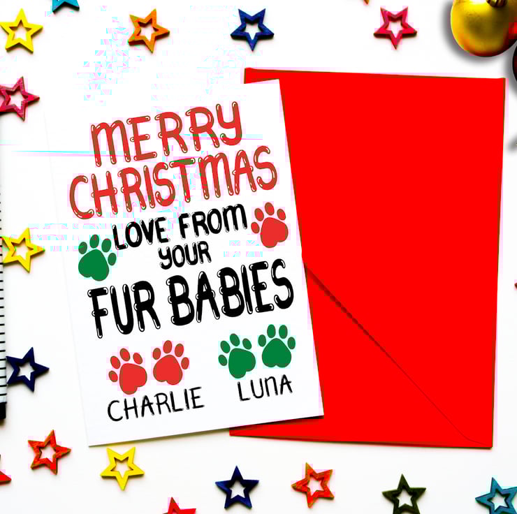 Greeting on front: MERRY CHRISTMAS LOVE FROM YOUR FUR BABIES (NAMES)