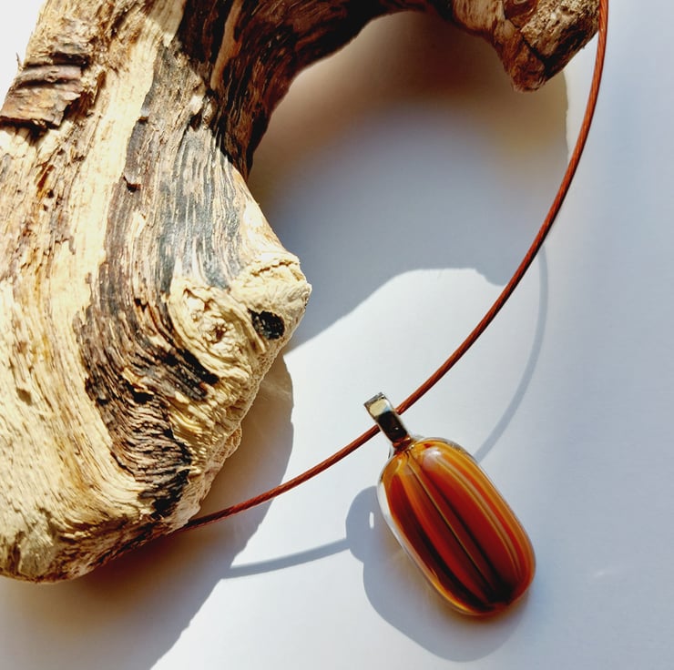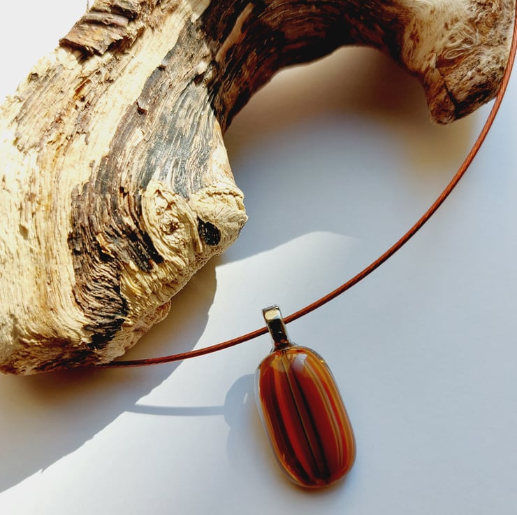 Striking Autumnal toned pendant made by me fully fusing pieces of bullseye glass together. The pendant comes on a brown 18 " screw clasp memory wire.