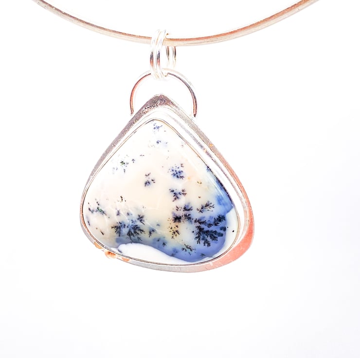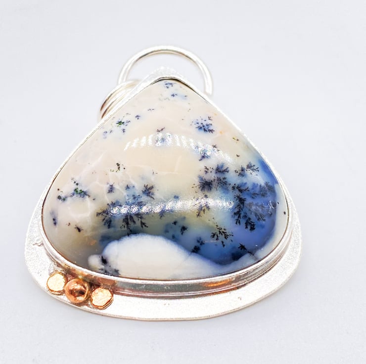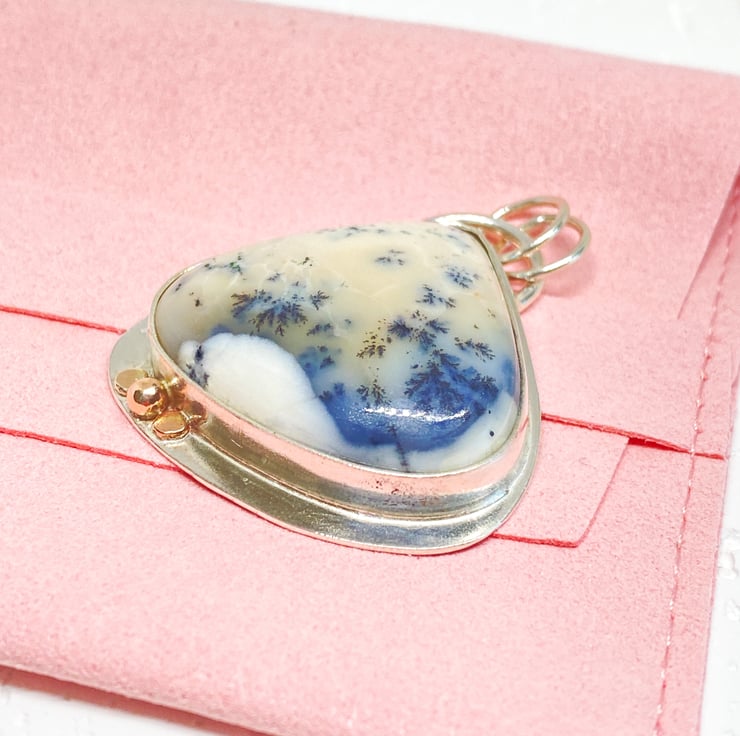 This elegant dendrite opal pendant features a captivating stone known for its natural, fern-like inclusions, creating a mesmerizing landscape within the gem. The opal is securely set in a sterling silver bezel, allowing its intricate patterns to be fully appreciated. On the front of the pendant, three solid gold granulation balls add a subtle touch of luxury and texture. The back of the pendant reveals a beautiful little butterfly cutout. This piece has an organic beauty, making it a truly unique accessory.