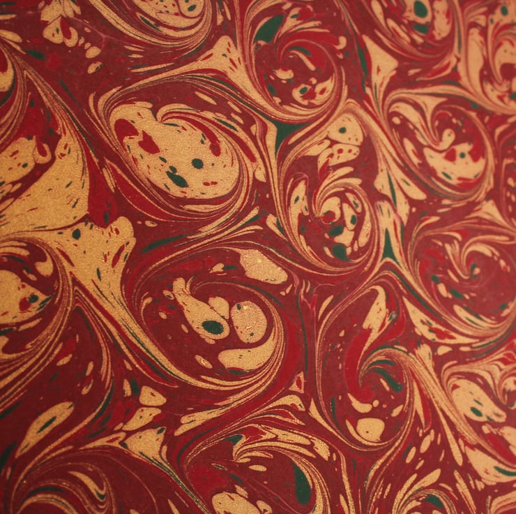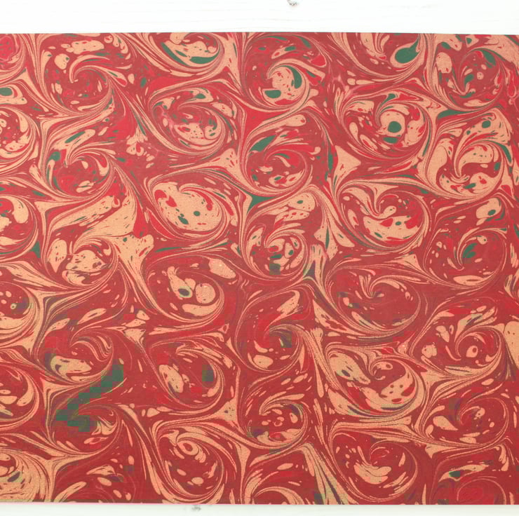 This is a beautiful festive coloured red, gold and green a4 sheet of card which has been marbled with a snail pattern.