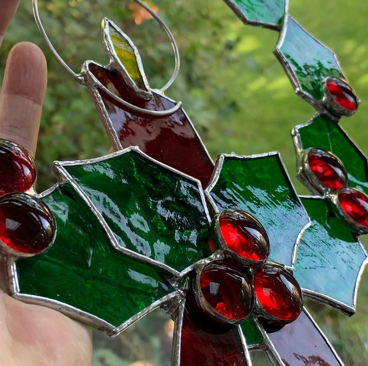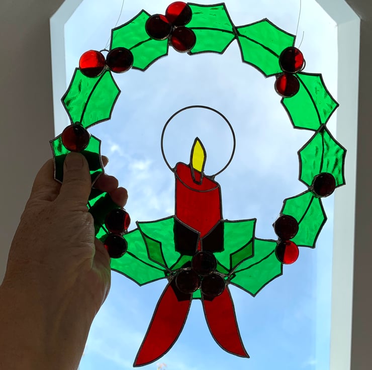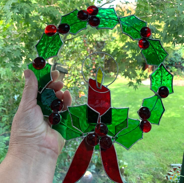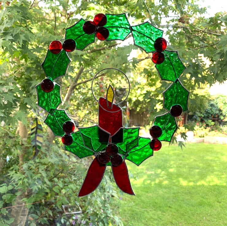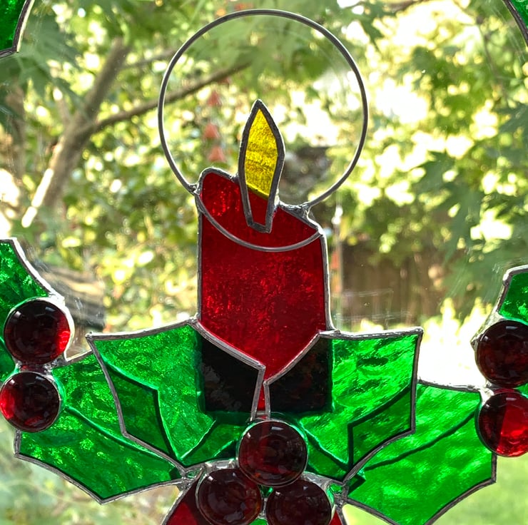 Each piece of glass has been cut by hand, ground, washed and foiled. The 12 leaves have been soldered to a tinned copper wire ring, 14 red glass nuggets have been used for the holly berries. The glass used is a Christmas green muffle glass for the leaves, red sea glass has been used for the candle and ribbon and yellow wissmach glass for the flame.