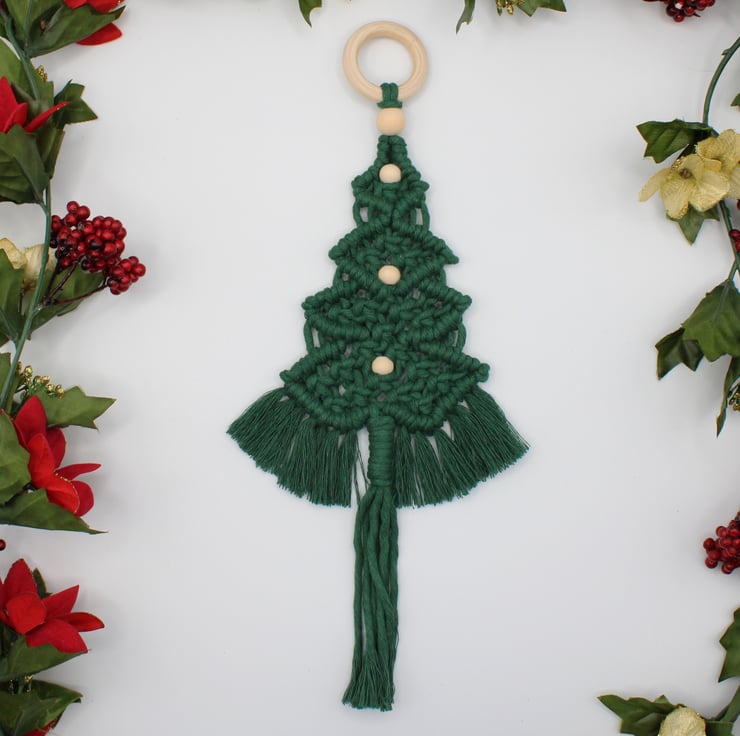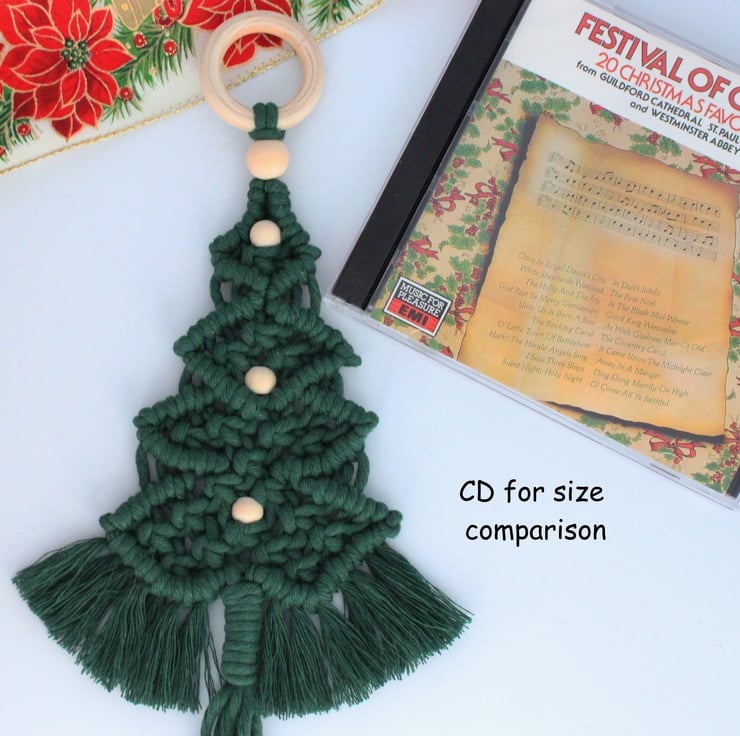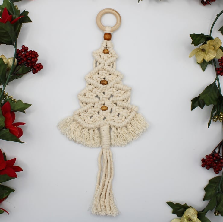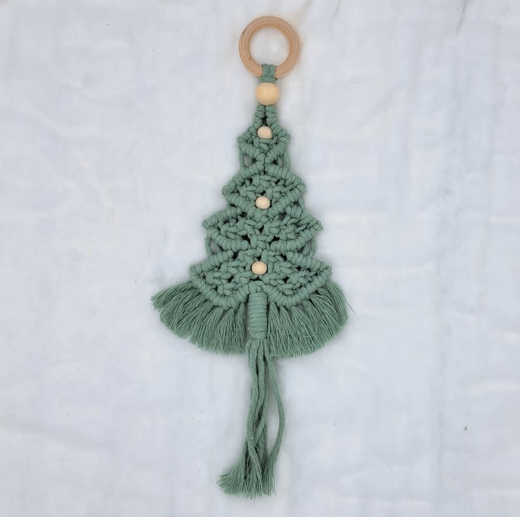 Each macramé tree has been knotted by hand to my own designs. They each have 4 wooden beads, three down the centre and a larger one at the top. Both trees are made from 100% recycled cotton and are tied to a wooden ring. The dark green one has untreated natural beads which contrast wonderfully with the colour of the tree. The other tree has been made in natural raw recycled cotton and the three smaller beads have a decorative design on them. All the beads on the natural tree have a varnish coating on them to bring out the colour of the wood.