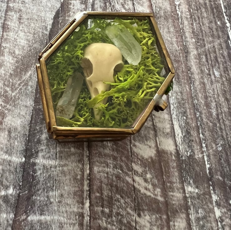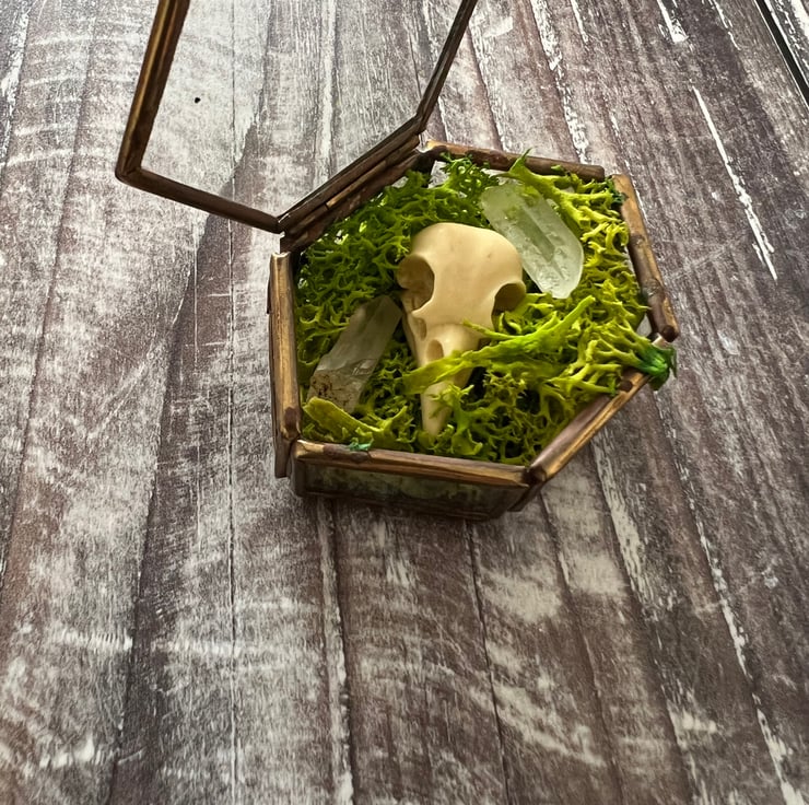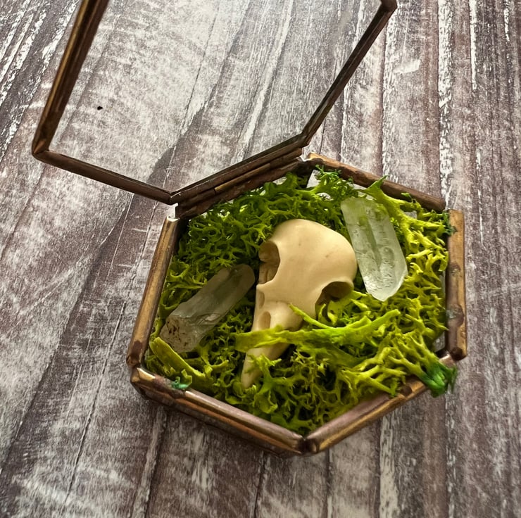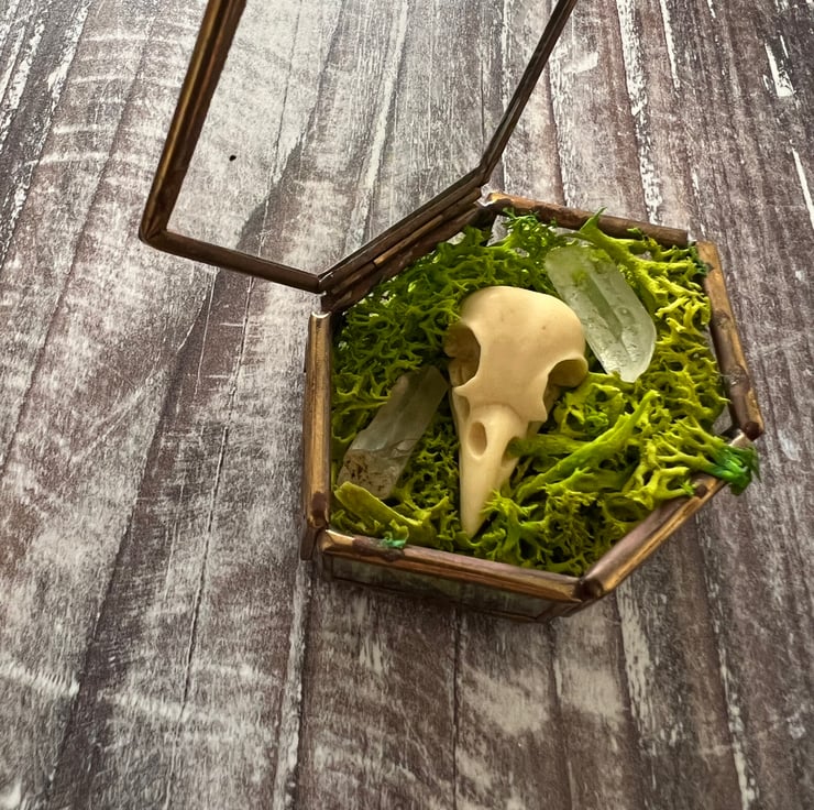 Faux taxidermy Crow Skull laid in amongst moss with a scattering of small crystal points.