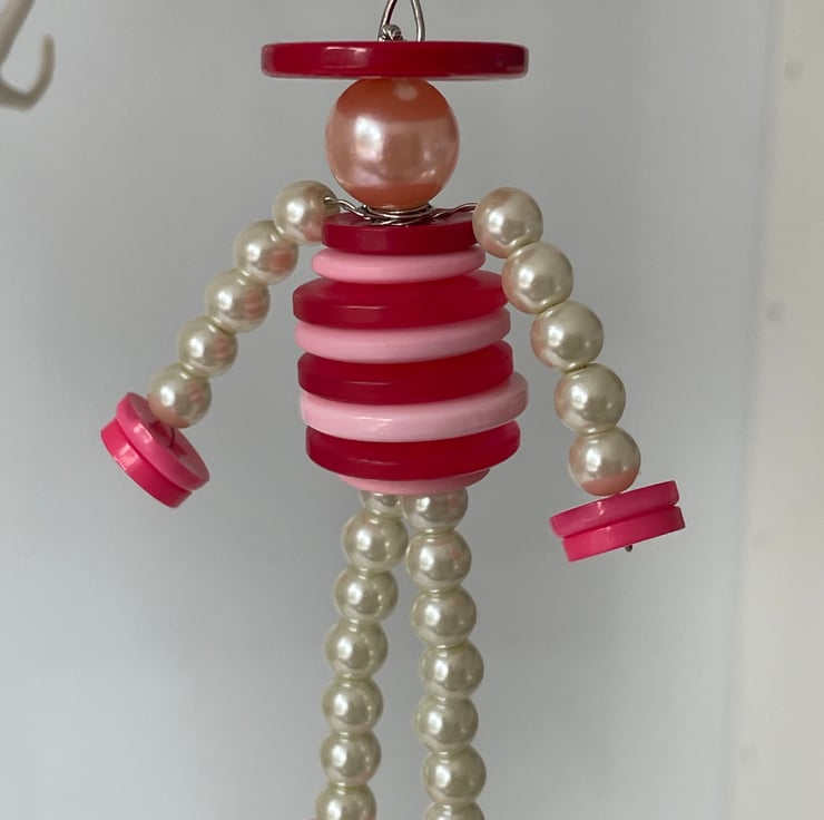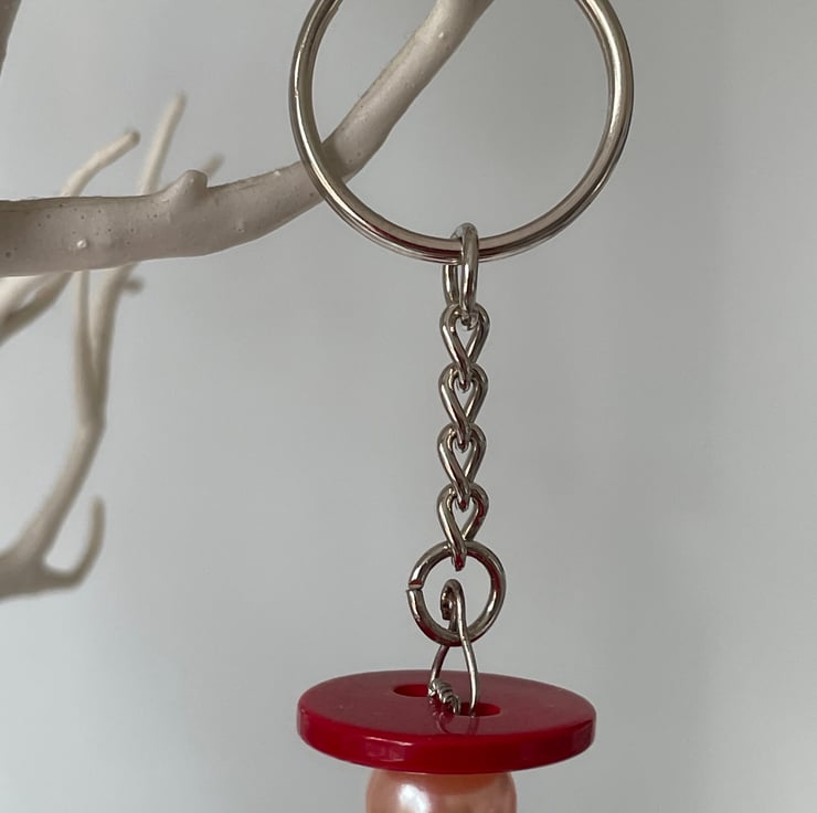 This handbag charm is made from plastic buttons and beads. It is securely held together with wire. Buttons are red and pink with ivory pearls.