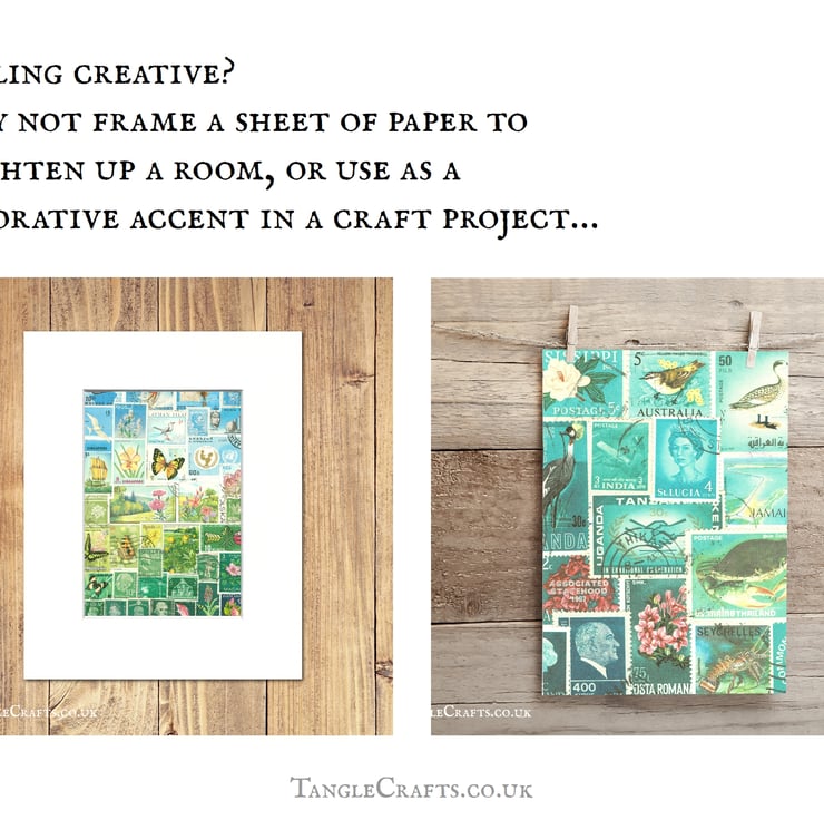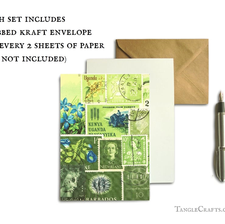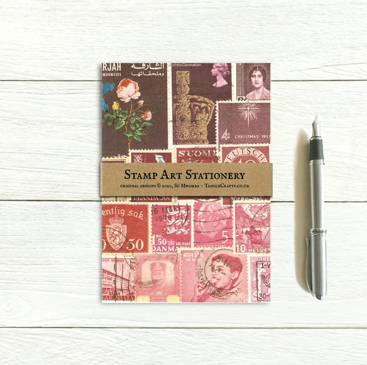 Professionally printed on luxurious, heavyweight 170gsm recycled paper, this writing set features reproductions of some of my original collage artwork featuring vintage postage stamps from around the world. The design is printed in full colour on one side, with the reverse blank for your message.