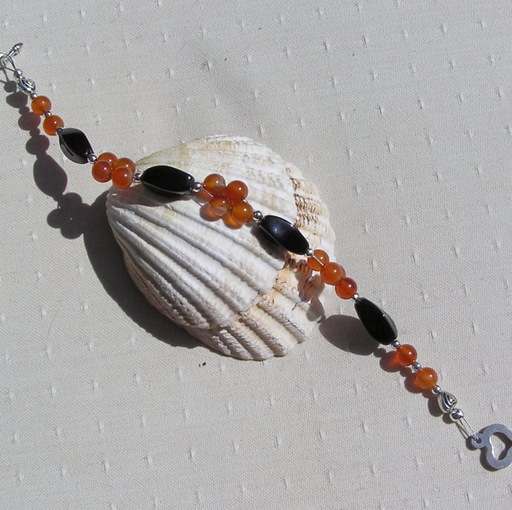 This Stunning Bracelet is made from Black Agate twisted Rhombus shaped beads separated by Red (Orange in colour) Agate round beads...the centre section of these clustered together in four's and for that added bit of sparkle tiny Silver spacer beads - a Rich sophisticated effect that will look stunning either worn casually or with something more Elegant for a Special Evening out