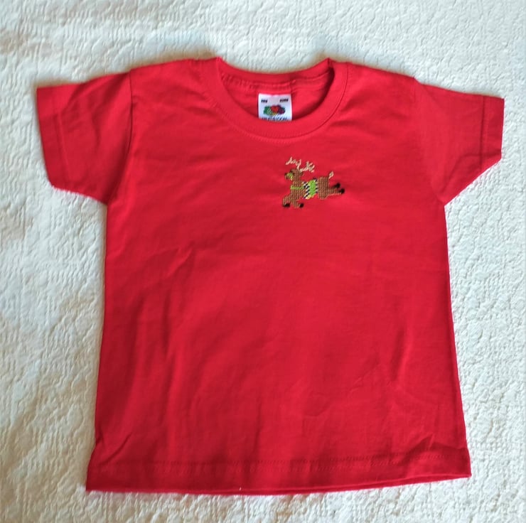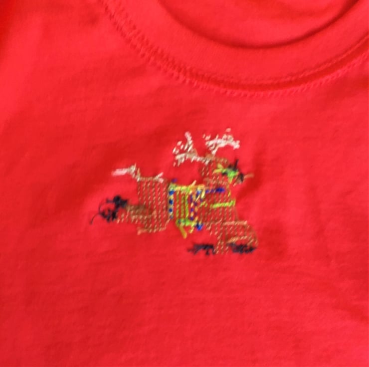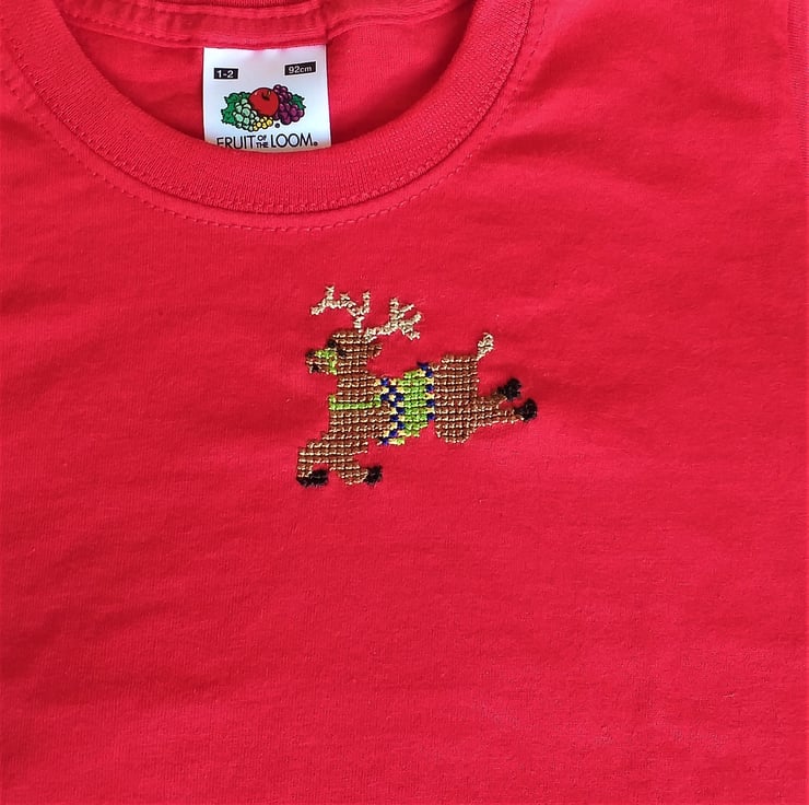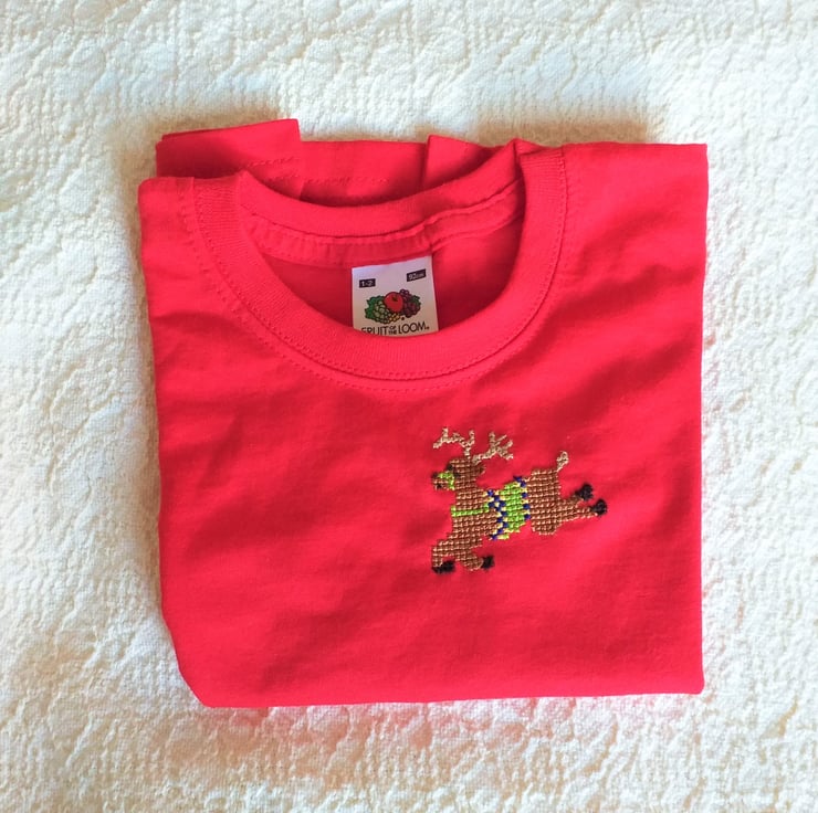 A reindeer is for life, not just for Christmas. I have hand embroidered a leaping reindeer on the left breast of this bright red, short-sleeved T-shirt by Fruit of the Loom. He wears a lime green, royal blue and golden yellow saddle and a green bridle. I never use a permanent backing material when embroidering kids' clothing, so there is nothing inside the shirt to irritate your child's skin. The shirt is 100% cotton and machine washable, though I advise a cool wash, because it is such a vibrant red!