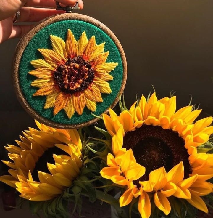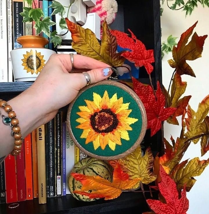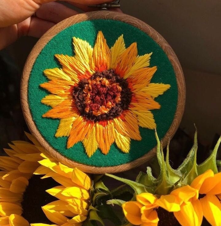 Golden sunflower hand embroidery on a rich green felt in a wood effect hoop with hook to hang on your wall.