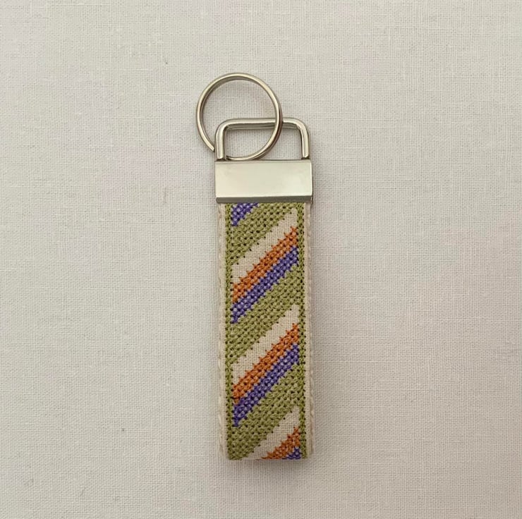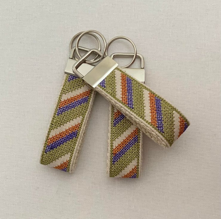 A cute and practical cross stitch embroidered keyring stitched on to a sturdy 25mm Cream Cotton webbing base.