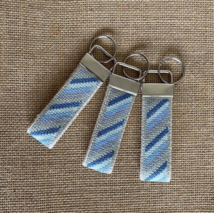 Cross stitch embroidered keyring stitched on to a sturdy 25mm Cream Cotton webbing.