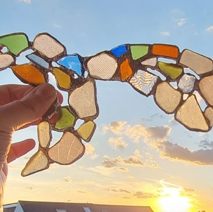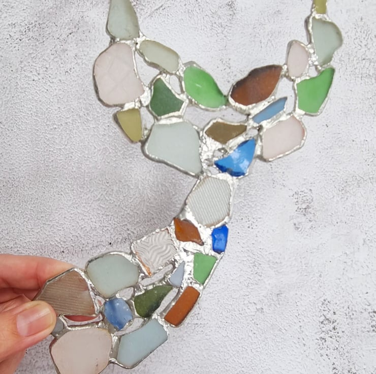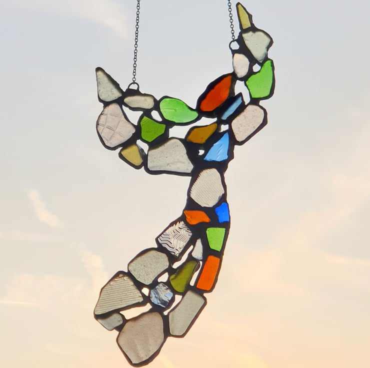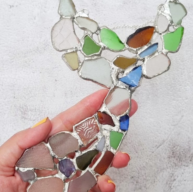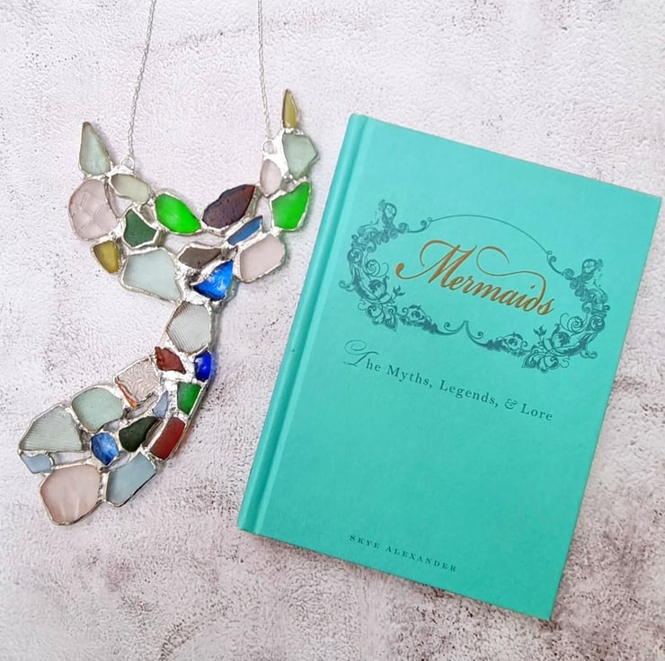 A beautiful and rustic looking suncatcher created with multi coloured sea glass that are soldered together to create a mosaic mermaid tail. The height of the suncatcher measures approximately 20 cm with silver chain.