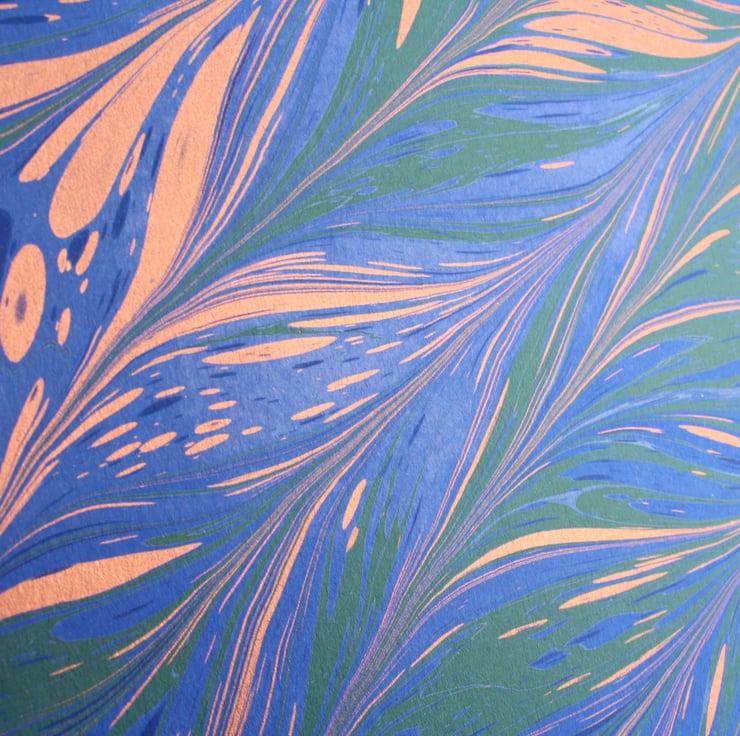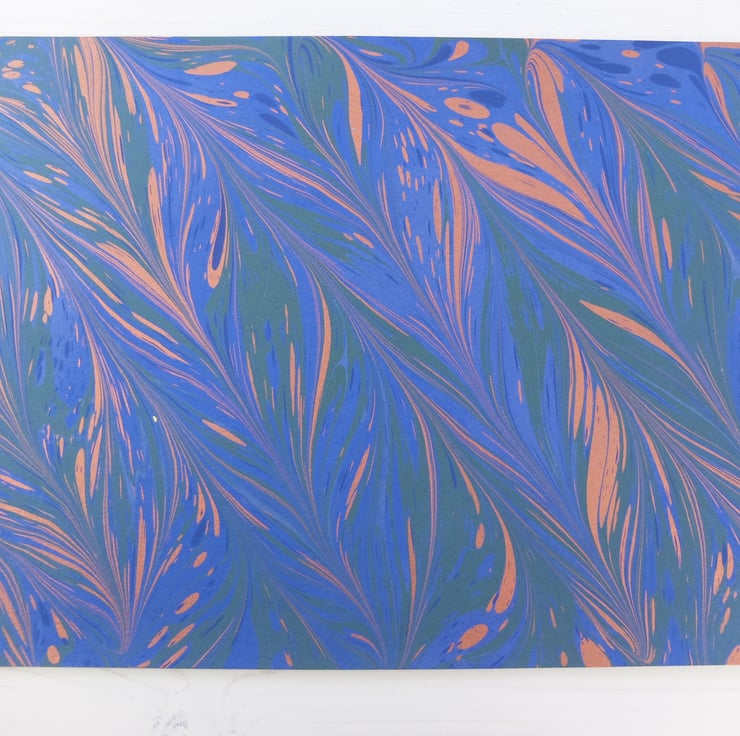 This is a beautiful blue, copper and green a4 sheet of card which has been marbled with a diagonal chevron pattern sometimes known as a feather pattern.