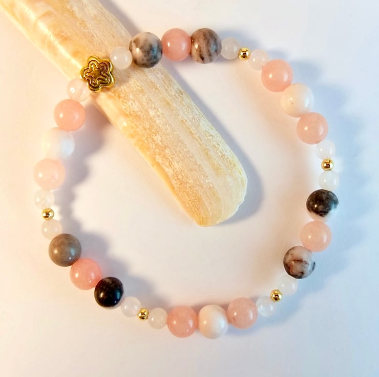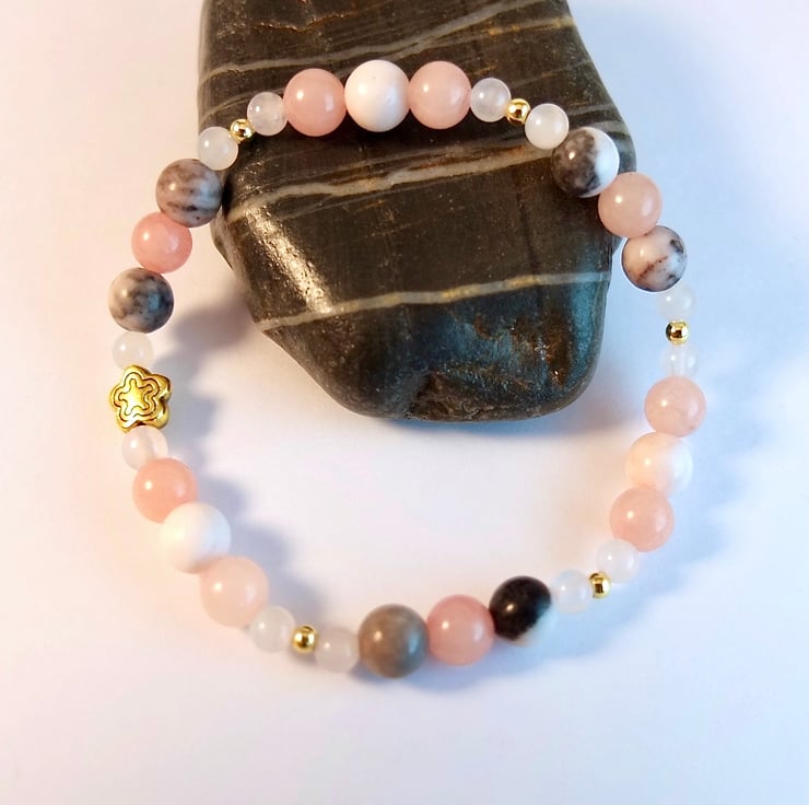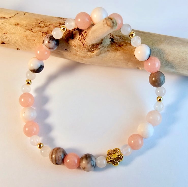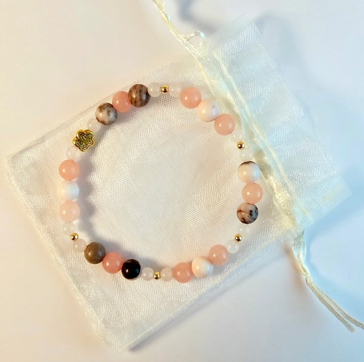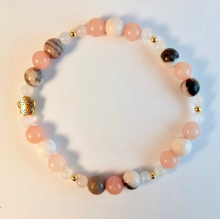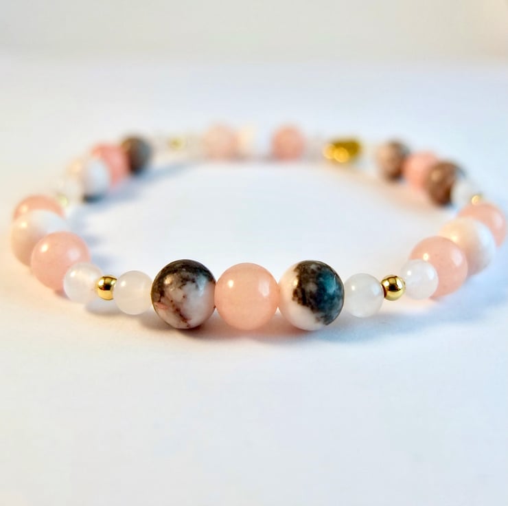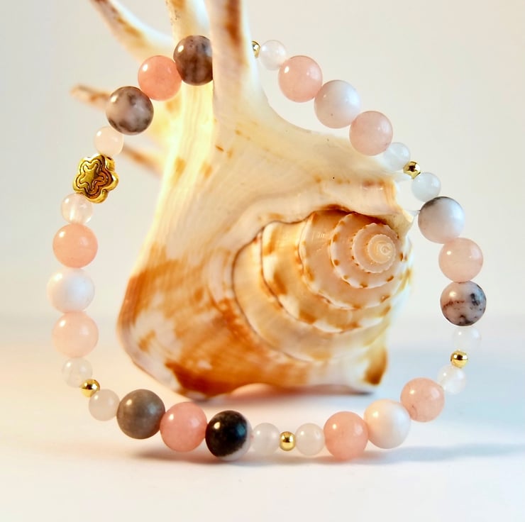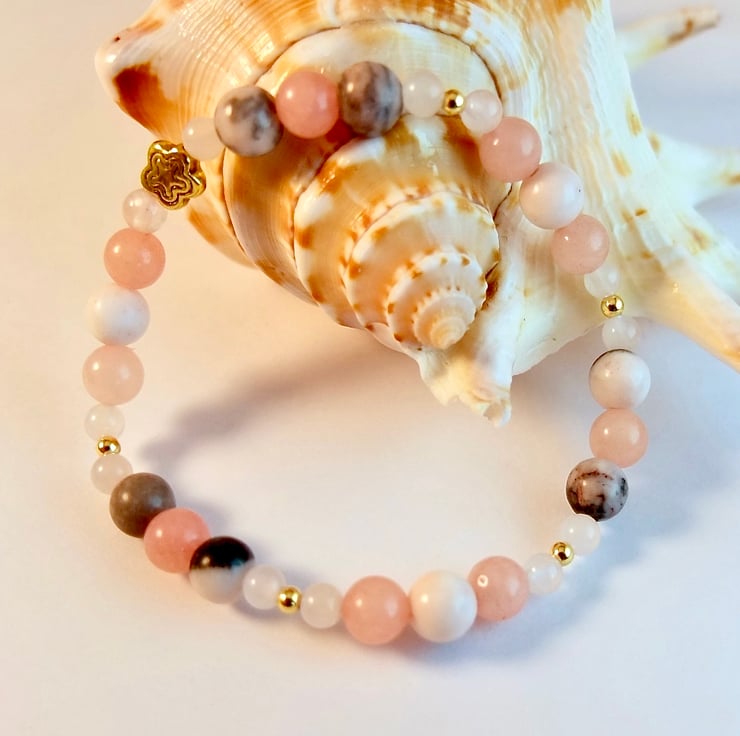 I have used 6mm beads of Pink Opal and Pink Zebra Jasper, combined with 4mm Rose Quartz and 3mm gold vermeil.