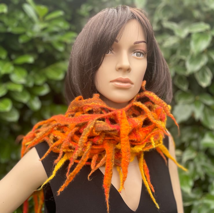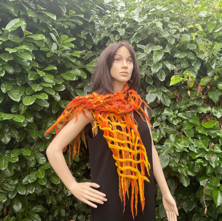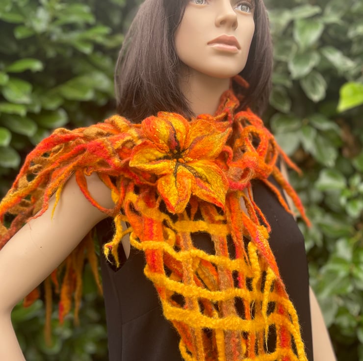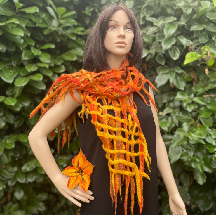 This beautiful Autumn Scarf with Brooch was made by me, by hand without the use of patterns, using the best soft organic merino wool in the wet felting technique.