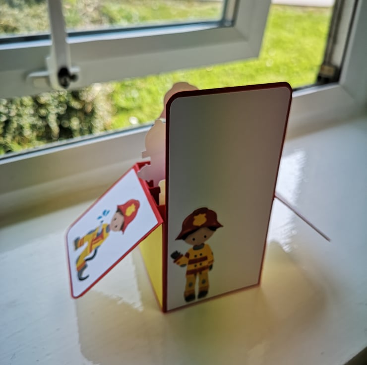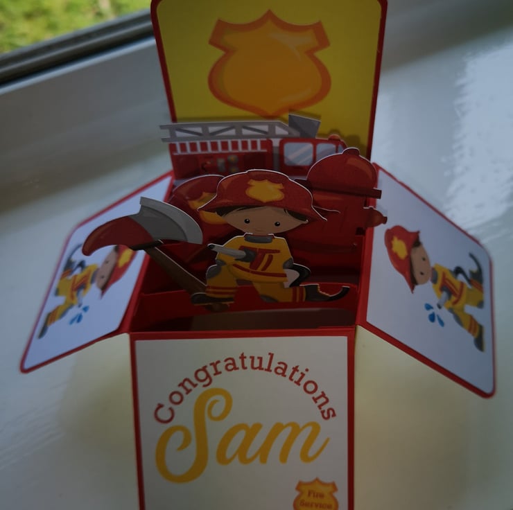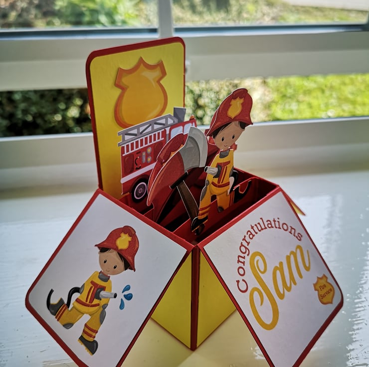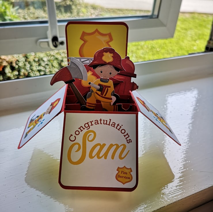This box card base is in red and topped with yellow card. The card is decorated with some Firemen, a fire engine, an axe and hydrant. The card base colour can be changed to your choice. The message on the front of the card can be personalised. Please complete the questions when you order this card.