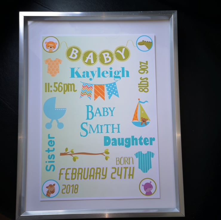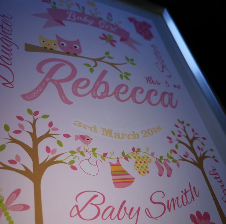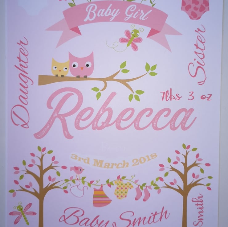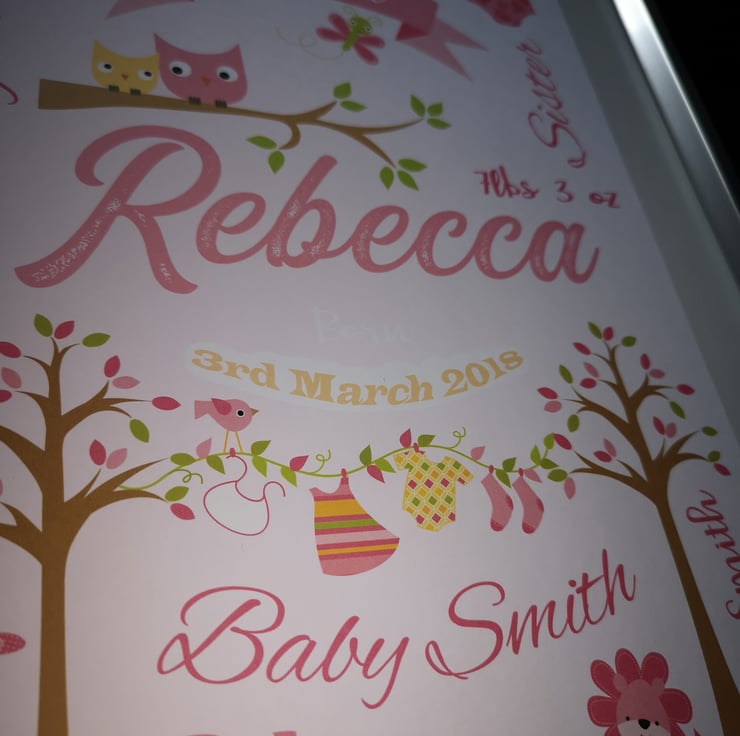 This print is in shades of pink listing new baby's name, birth weight and date of birth and whether they are a sister (this can be left out if necessary). The print is decorated with pretty little animals and baby themed images.