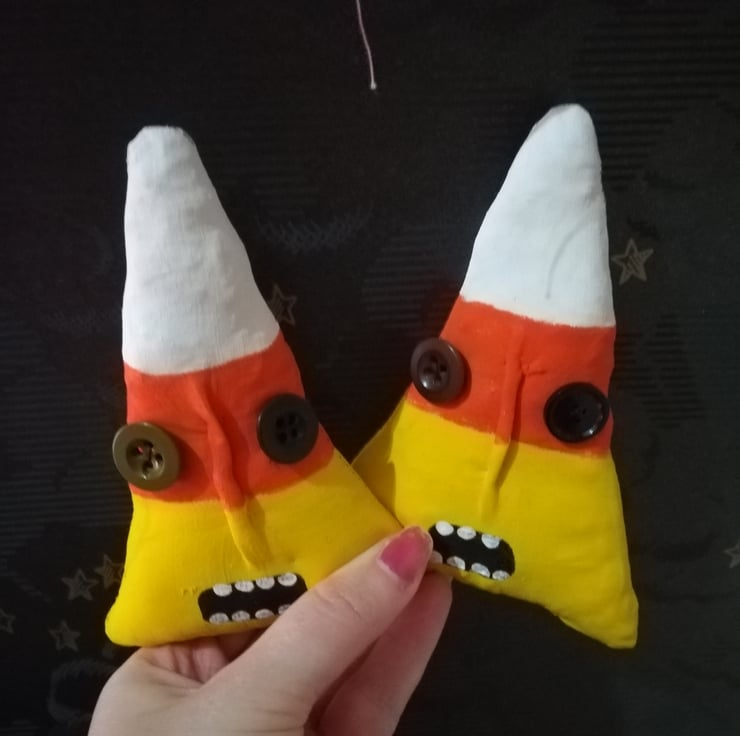 These little candy corn bowl fillers are stitched with vintage fabric. They are stuffed with rags to give a primitive look and feel.