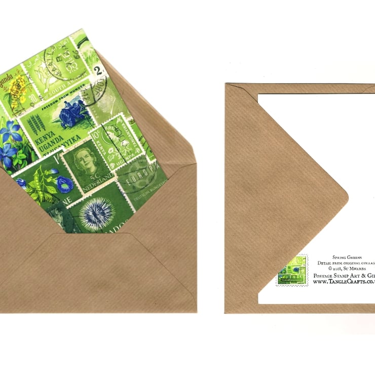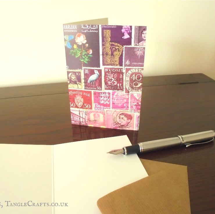 Featuring postage stamps from around the world, the designs are reproduced from my original collage artwork, and provide a real sense of history and vintage travel. The designs are nicely non-specific, and lend themselves to use for almost any purpose: Birthday, Mother's / Father's Day, Good Luck, Bon Voyage, Thinking of You, Thank You etc... These cards will appeal to stamp collectors, history buffs, writers, travelers, and bohemian souls alike!