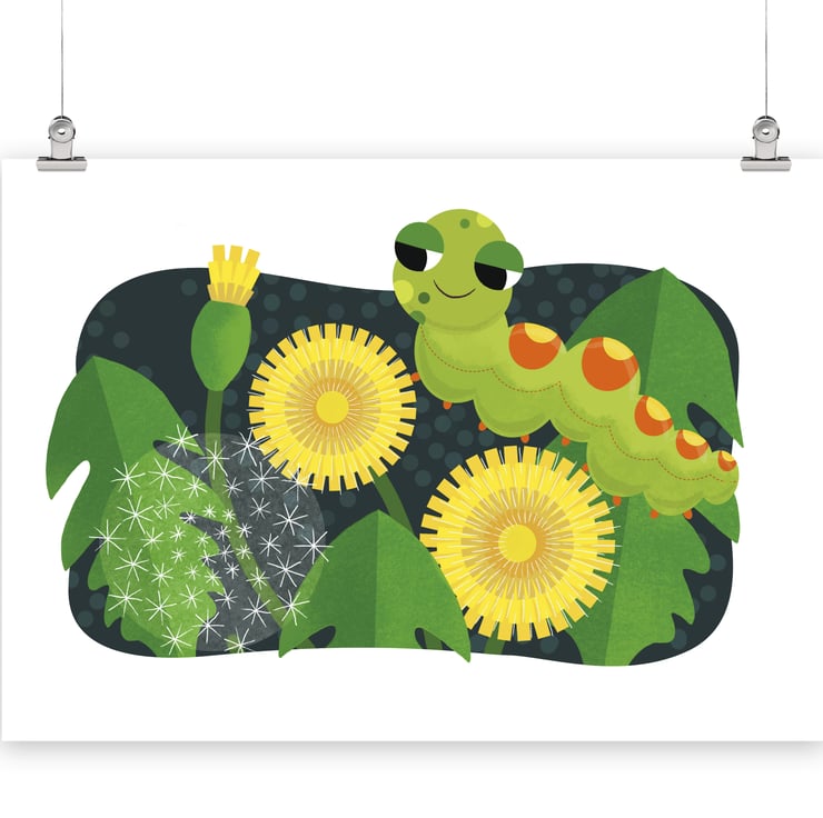 Friendly caterpillar amongst the dandelions illustration- A3 art print