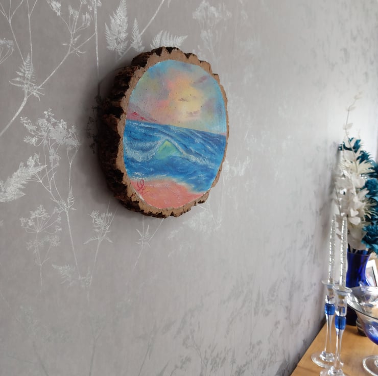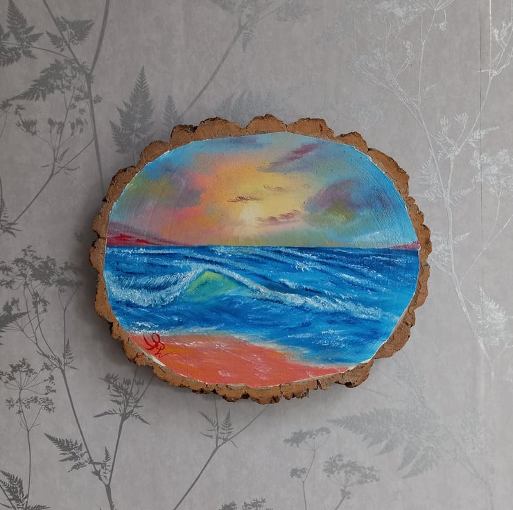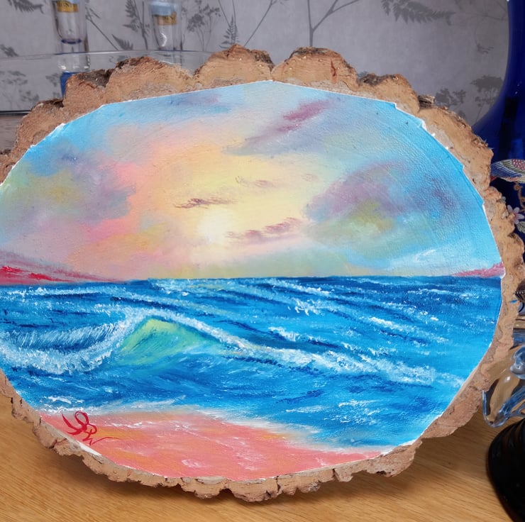 Title; Crashing Waves. Beautiful colourful Oil Painting of Waves on a slice of Apollonia wood.