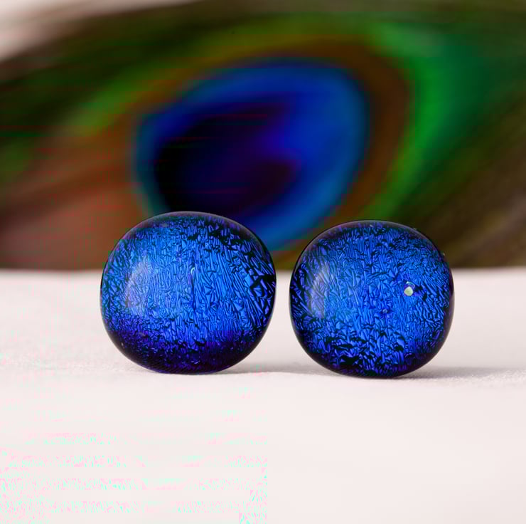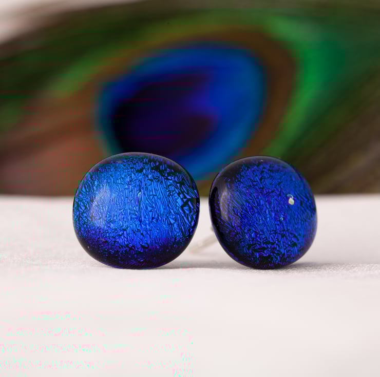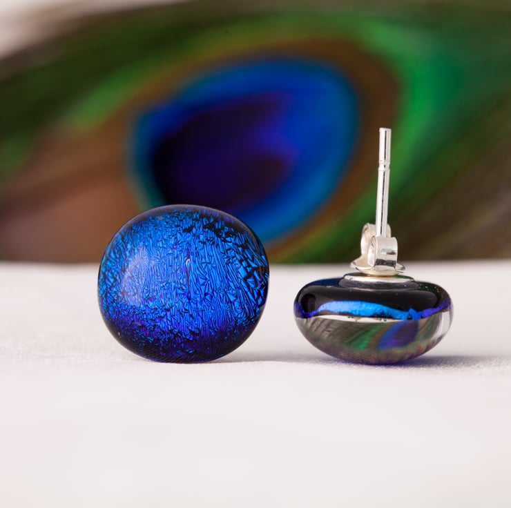 These treasures are one of a kind handmade fused dichroic glass stud earrings. They’ve been pictured directly facing and with one earring at an angle to show how the colour change.