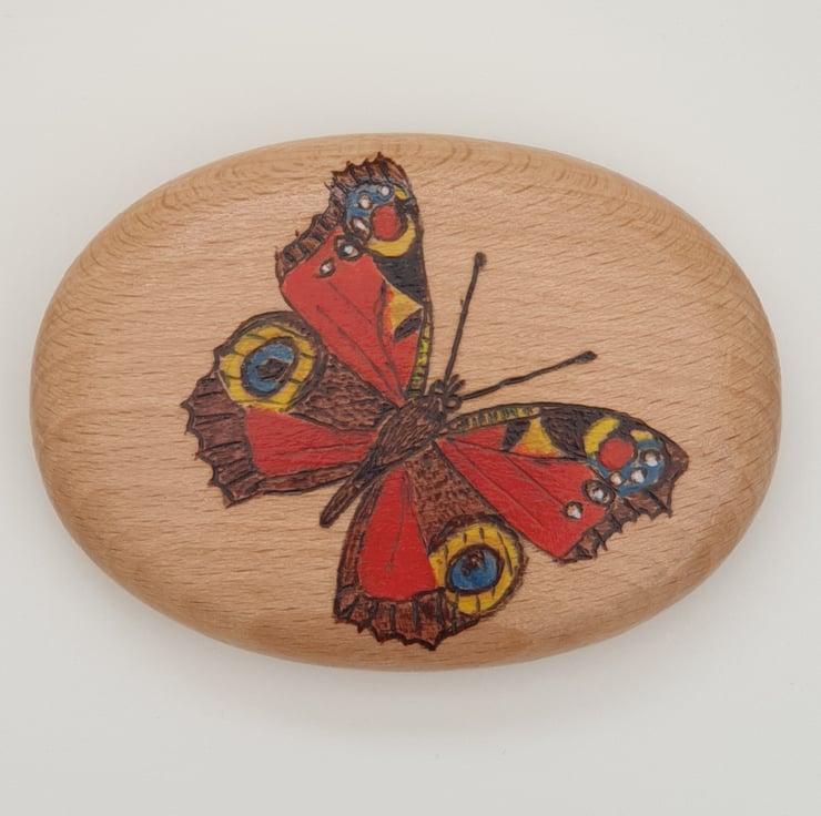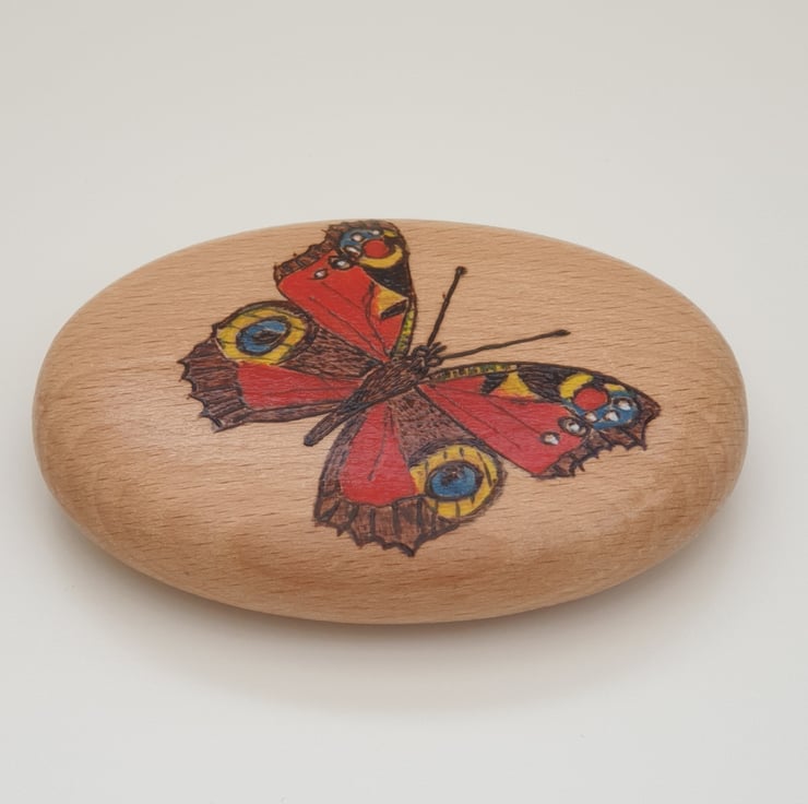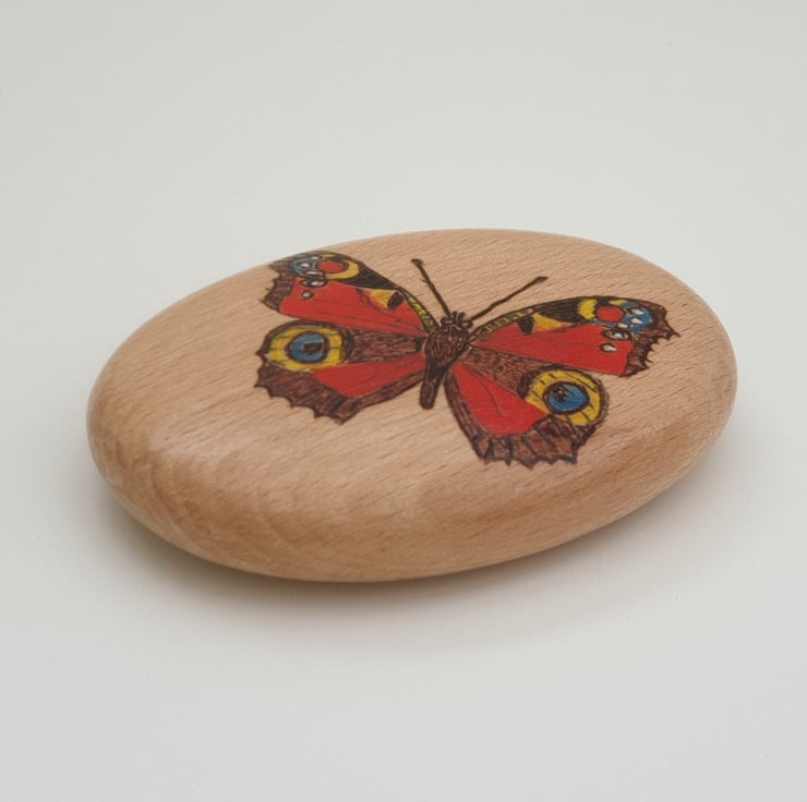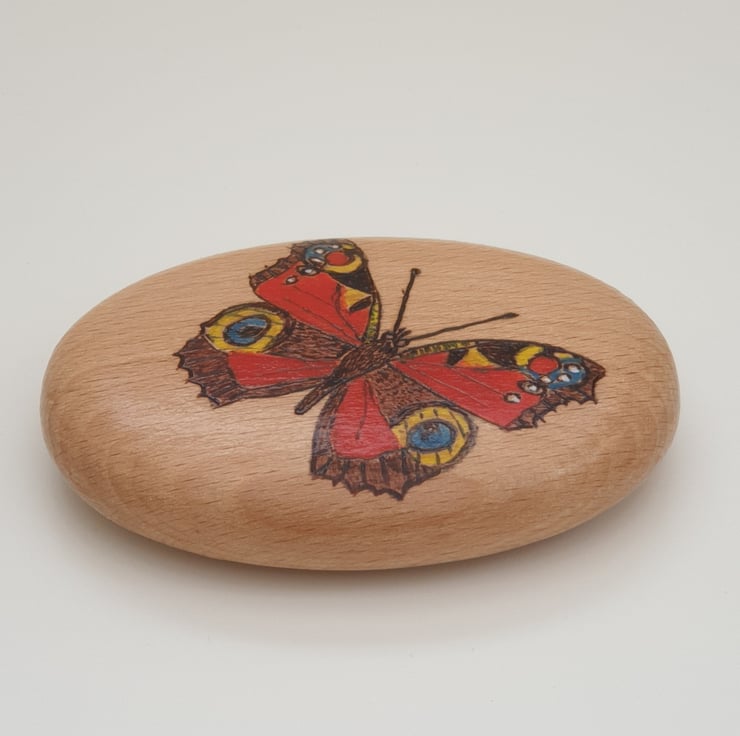 Lovely British hardwood pebble featuring a beautiful peacock butterfly which has been handburnt using the art of pyrography and coloured with acrylic washes to bring it to life. The pebble has then been finished with several coats of interior satin varnish.