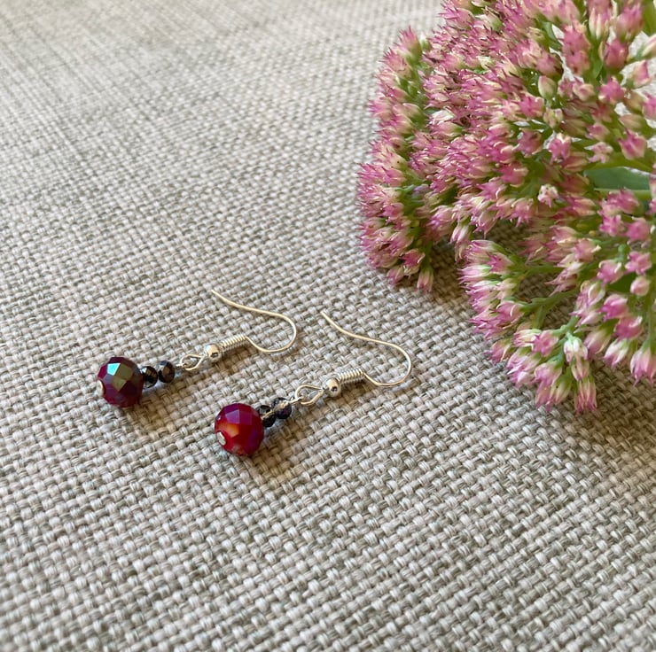 Sparkly earrings made with deep red faceted beads, smokey-grey crystal beads and silver-plated earring hooks. The earrings are approximately 3cm in length including the hook.