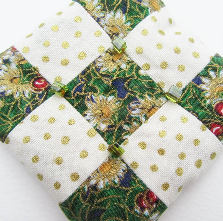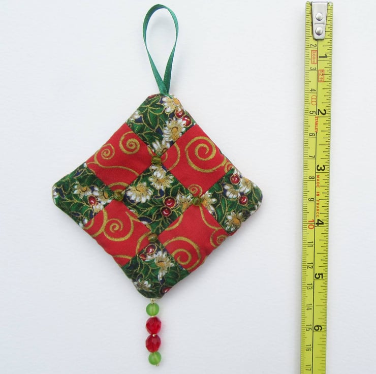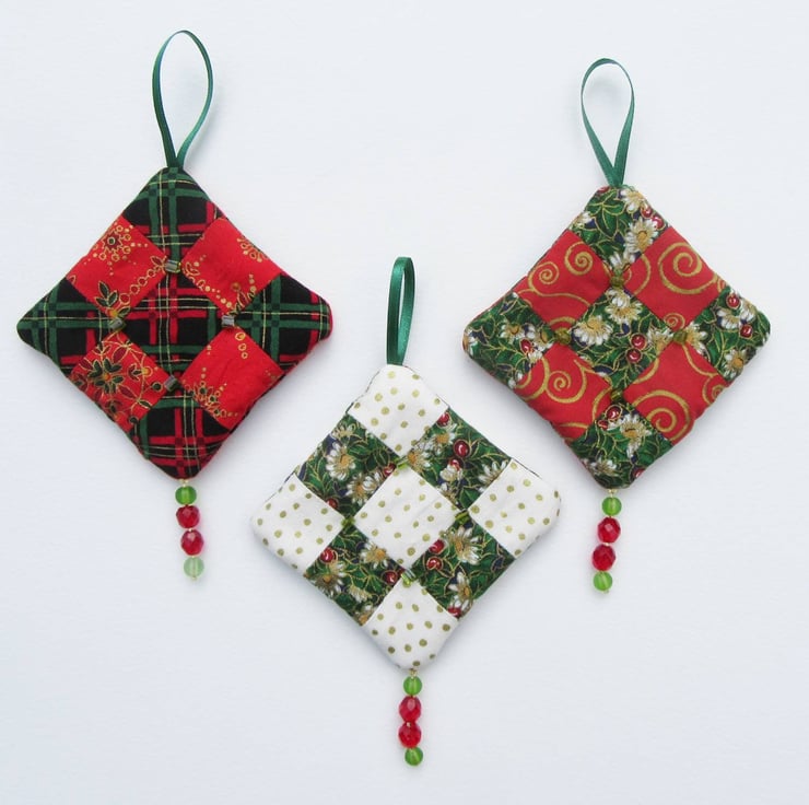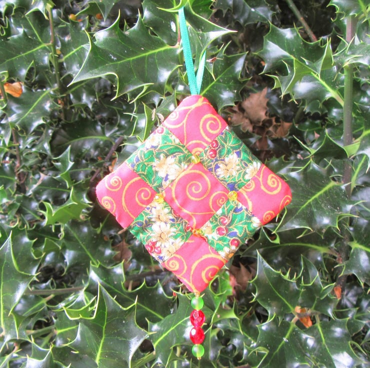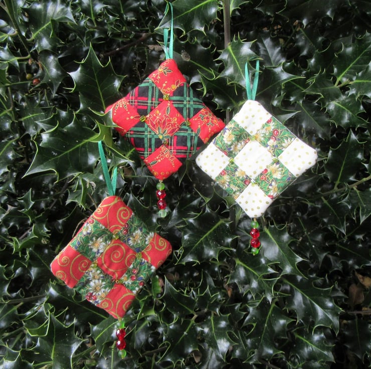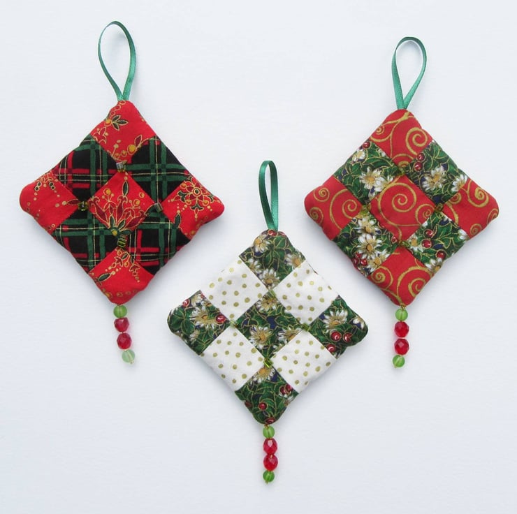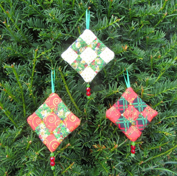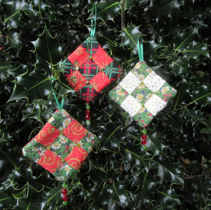 I've used 100% cotton festive print fabrics to make the patchwork and filled each decoration with a double layer of quilters wadding to give them extra depth. The decorations have patchwork and beads on both sides so they can be hung and viewed from any direction.
