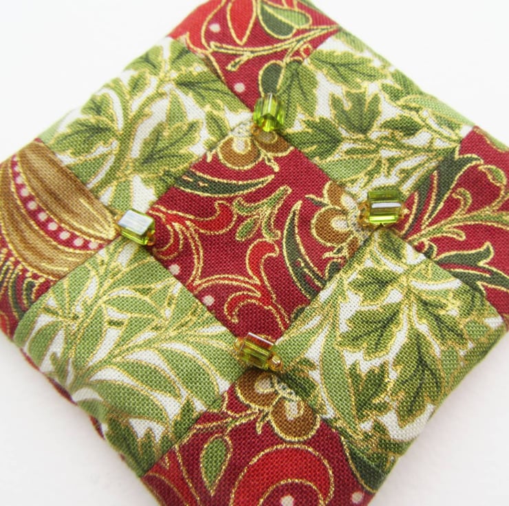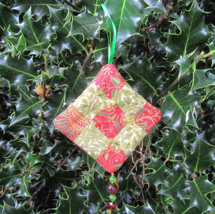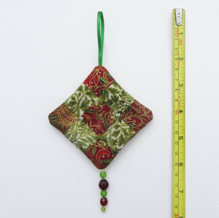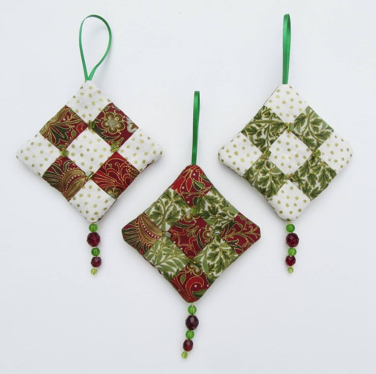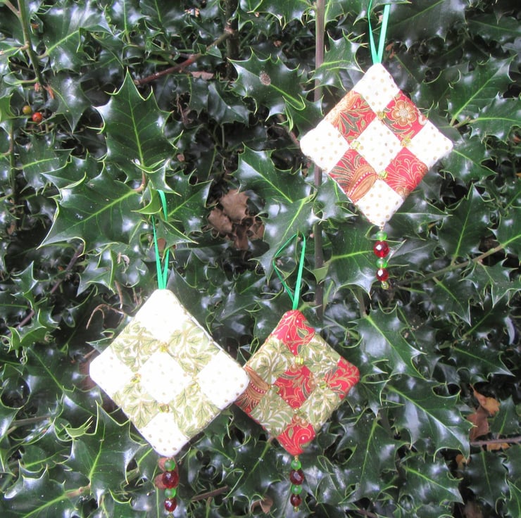 I've used 100% cotton festive print fabrics to make the patchwork and filled each decoration with a double layer of quilters wadding to give them extra depth. The decorations have patchwork and beads on both sides so they can be hung and viewed from any direction.