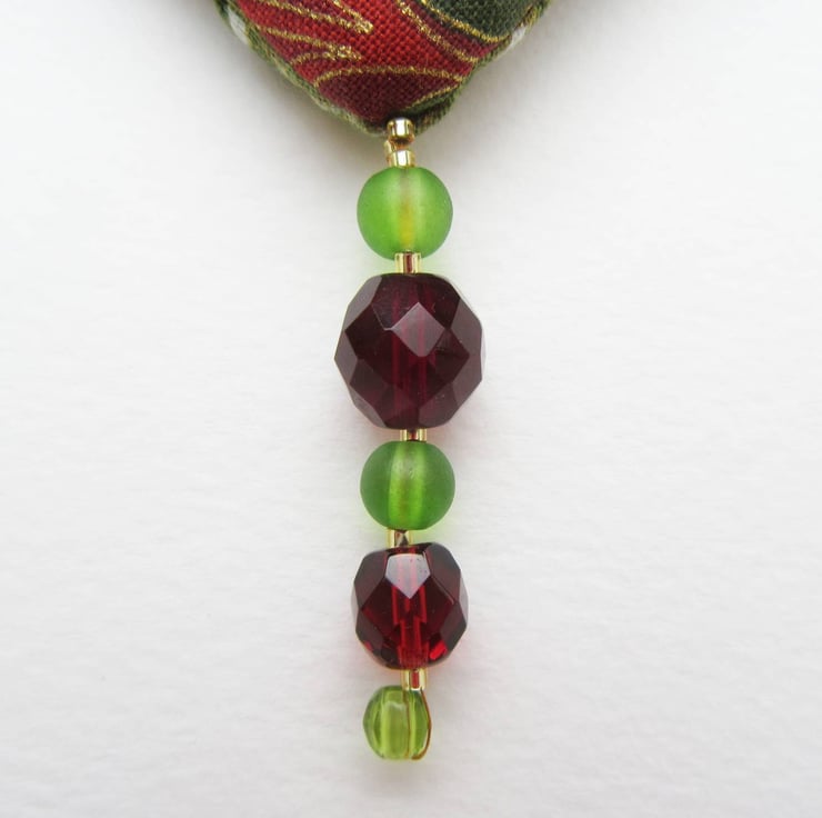 A set of three fabric tree decorations. Adorned with beads, all carefully stitched in place by hand along with a secure ribbon hanger also stitched in place.