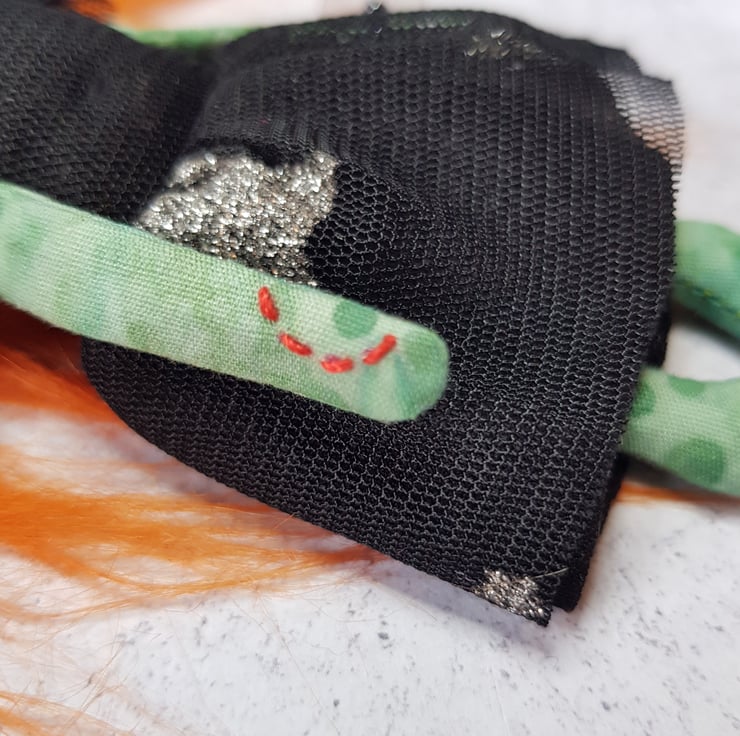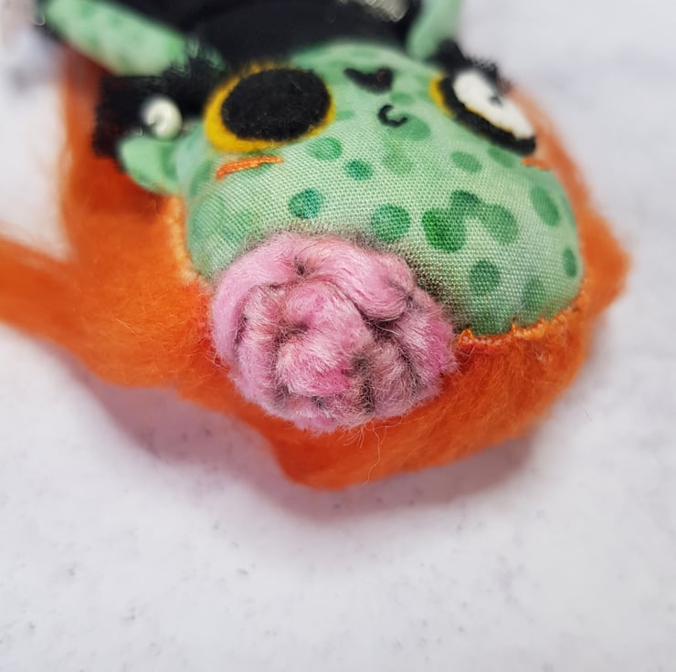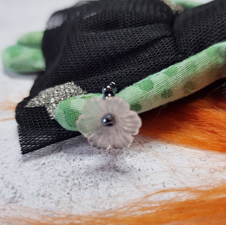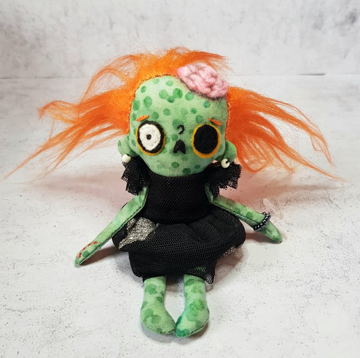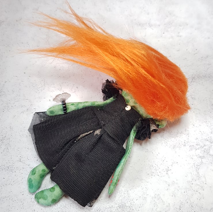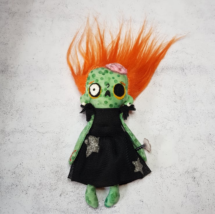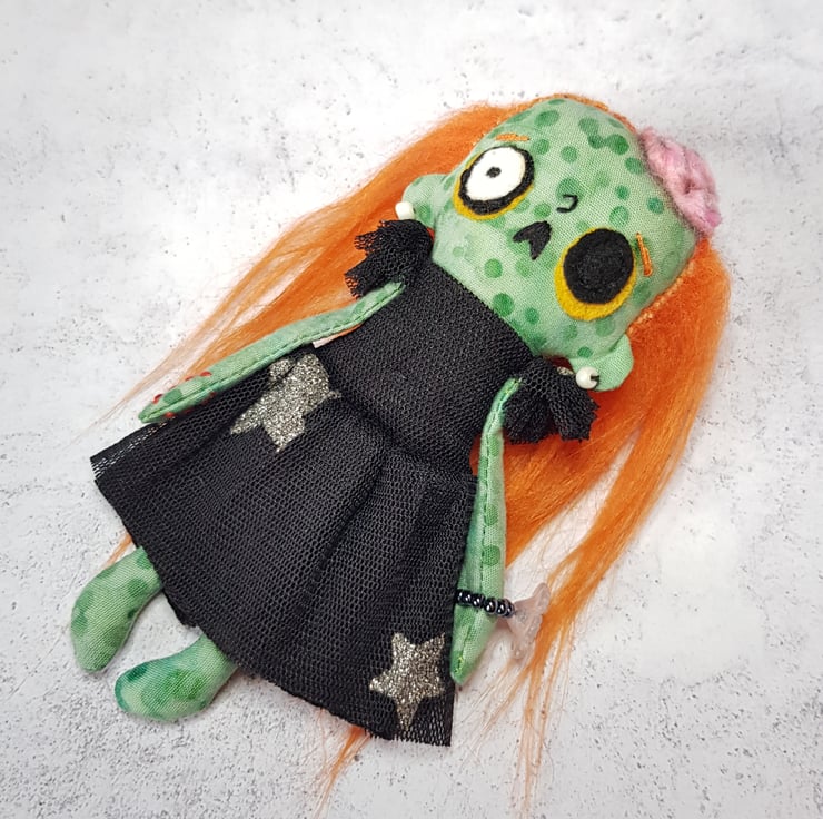 This little lady is having the worst party. She's all dressed up in a hand sewn upcycled tulle gown with silver sparkly stars and matching upcycled bead corsage on her wrist but she's been bitten. You can see the hand embroidered bite mark on her arm. Her little needle felted brains are showing too and her hand sewn, faux fur hair is looking a little bedraggled. She measures roughly 11.5cm tall and is an art doll, not a toy. For decorative purposes only.