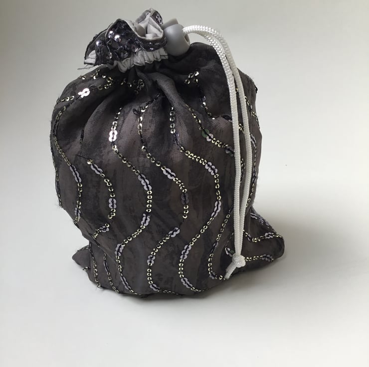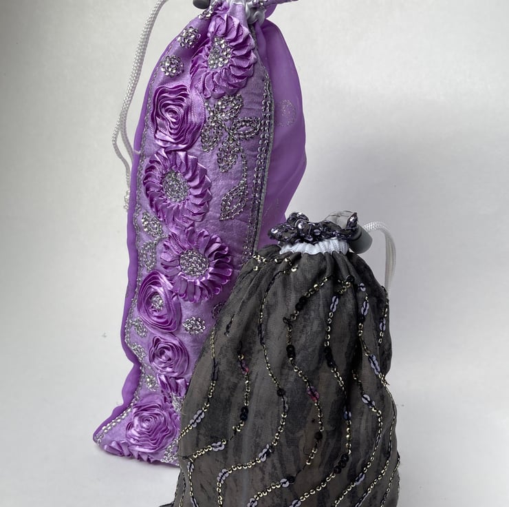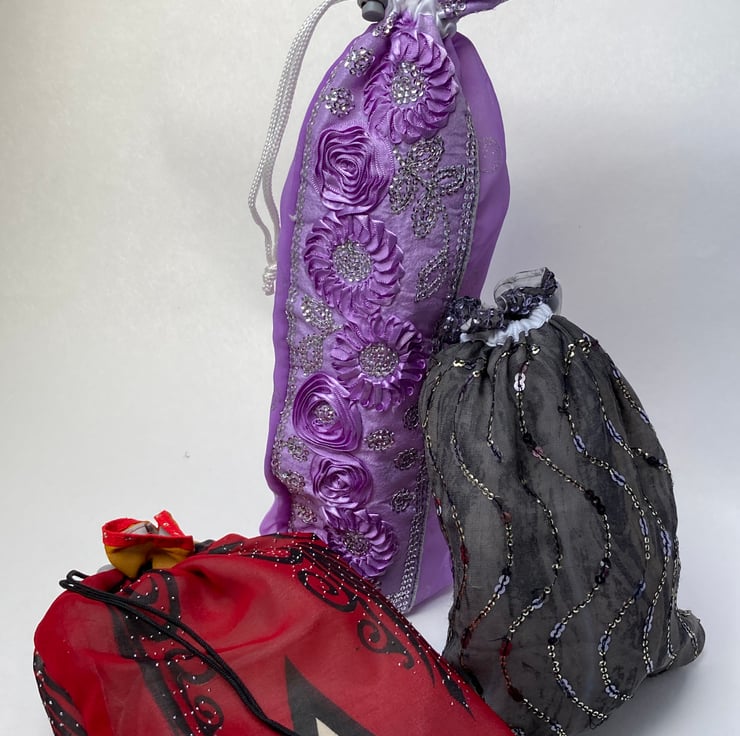 I think you will love this set of three fabric gift bags, all made from repurposed sari fabric. Each bag is lined with plain lining and has a drawstring cord. Your gifts can be presented in these bags, looking uniquely beautiful. The double layer of fabric conceals the contents and the drawstring makes both wrapping and unwrapping a pleasure.