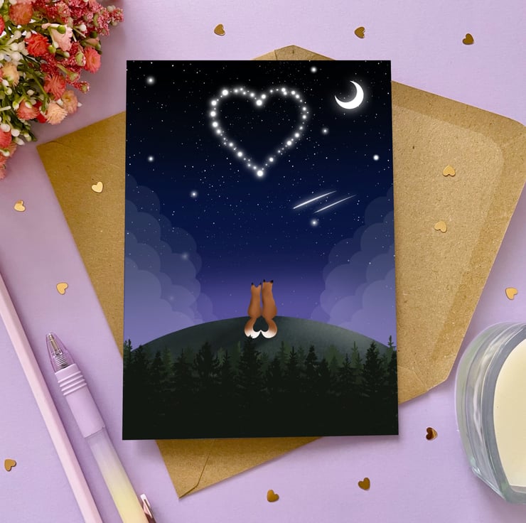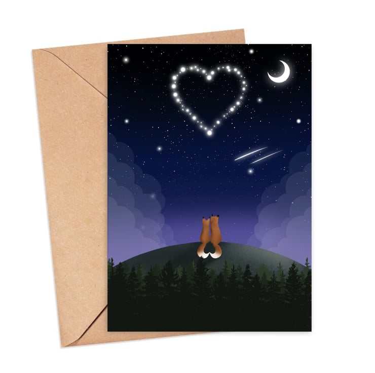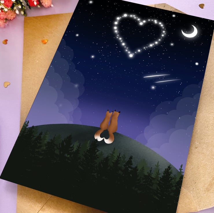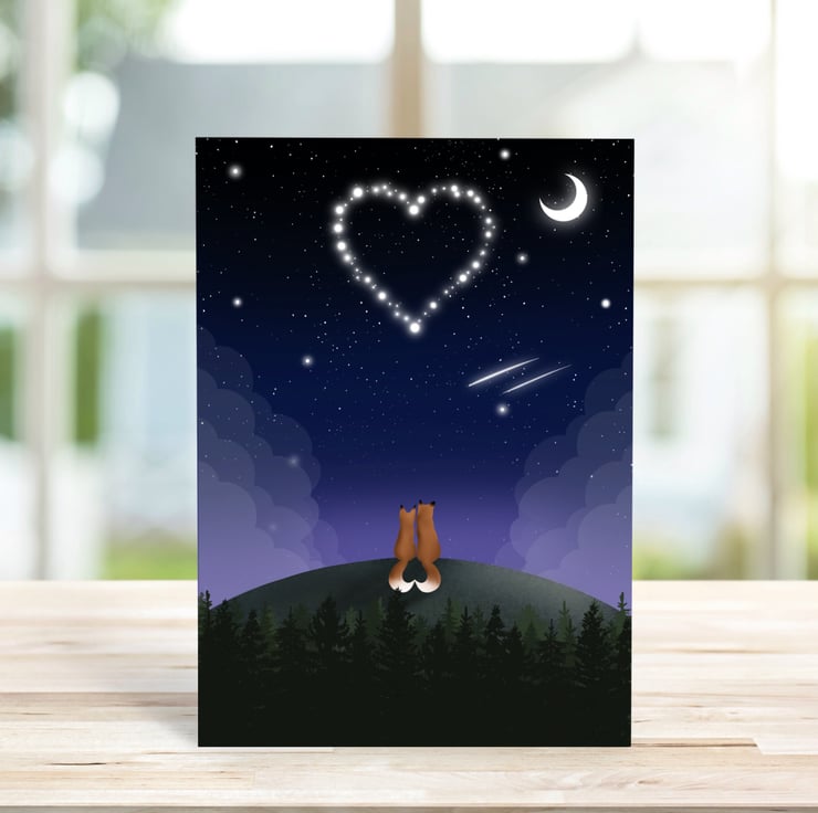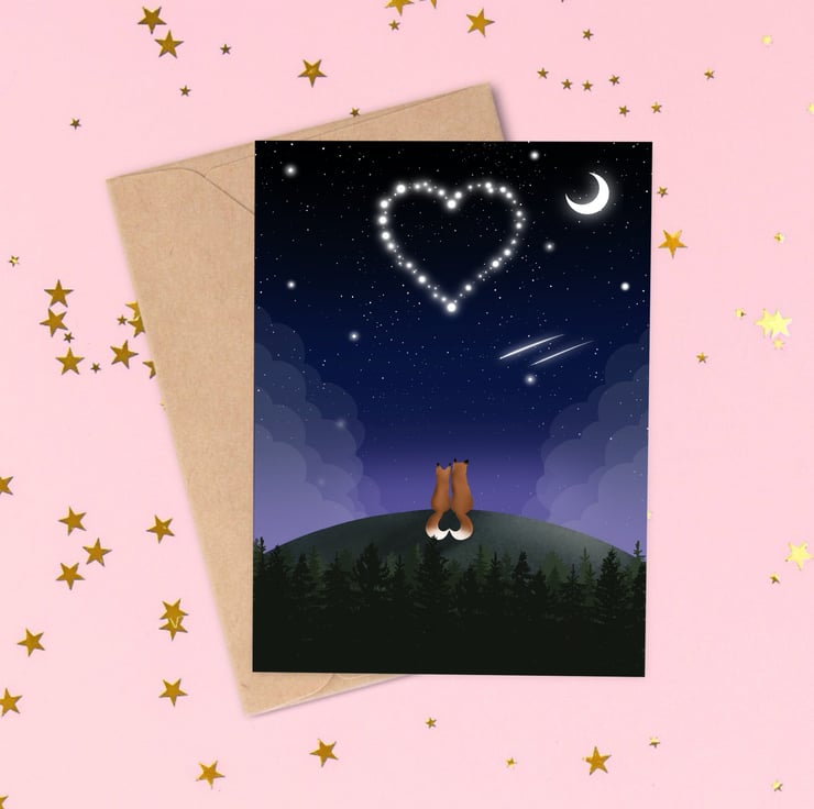 This cute pair of loved up foxes are sitting under the stars and enjoying the view. The stars are also in the shape of a heart to show that extra bit of love.