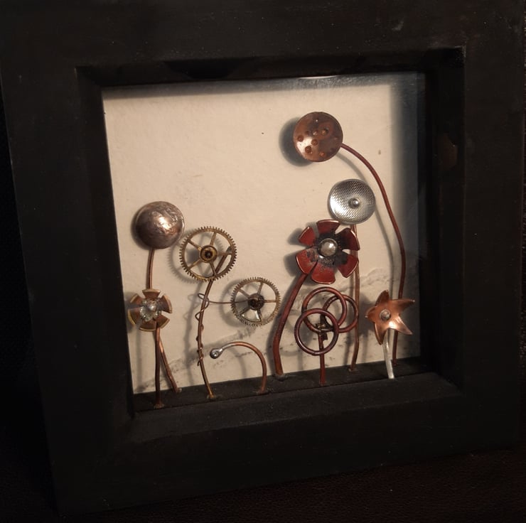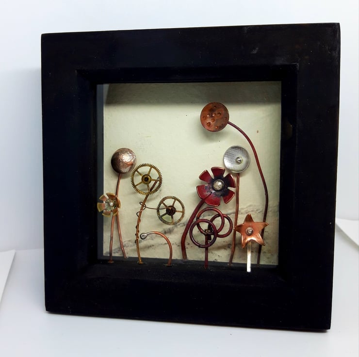 This scene (or diorama as they are sometimes called) features a field of futuristic flowers! Made from copper, brass, silver and watch cogs - each one is different - the flowers of my imagination. The black wooden frame is approx 12x12cm.
